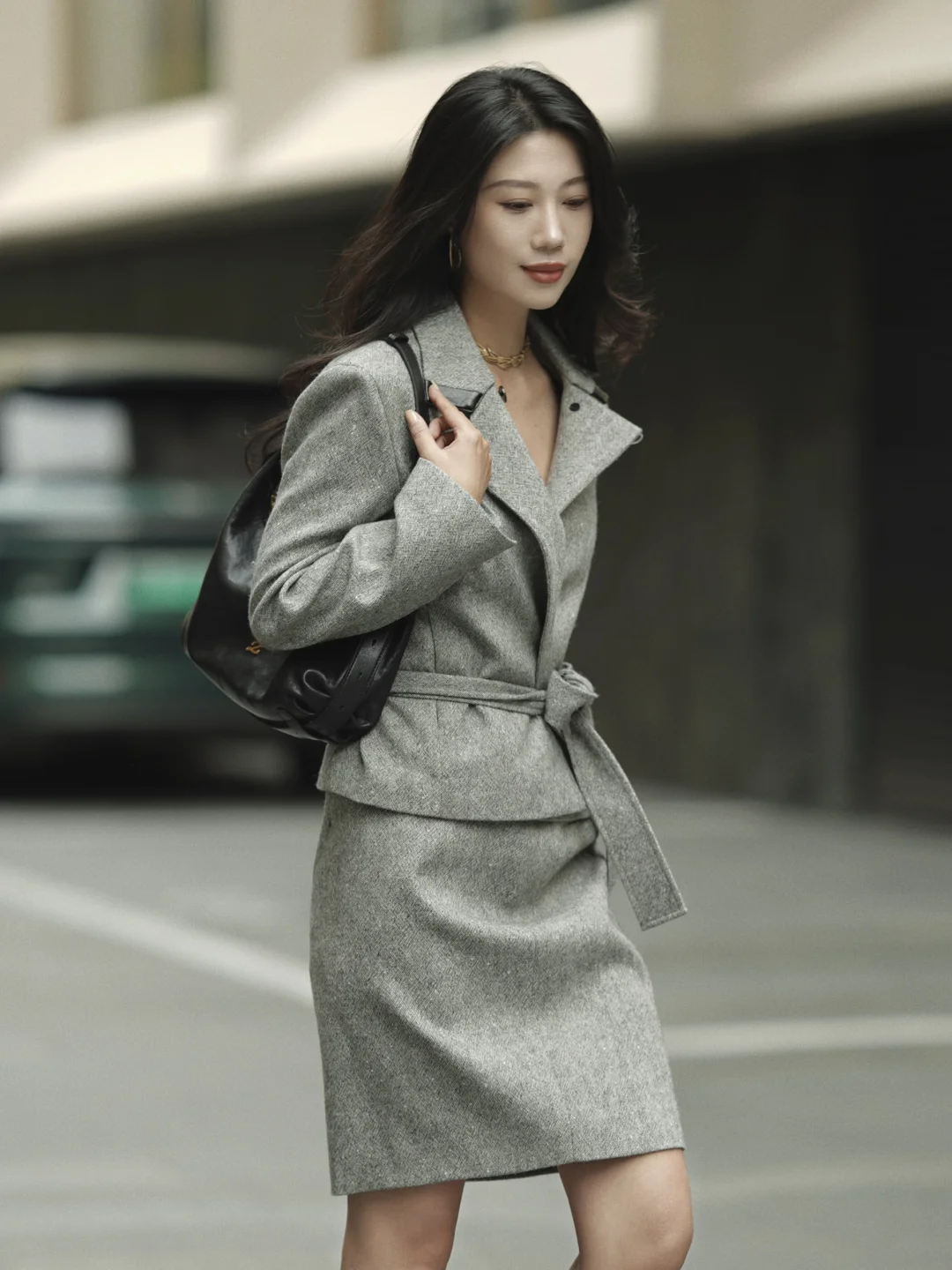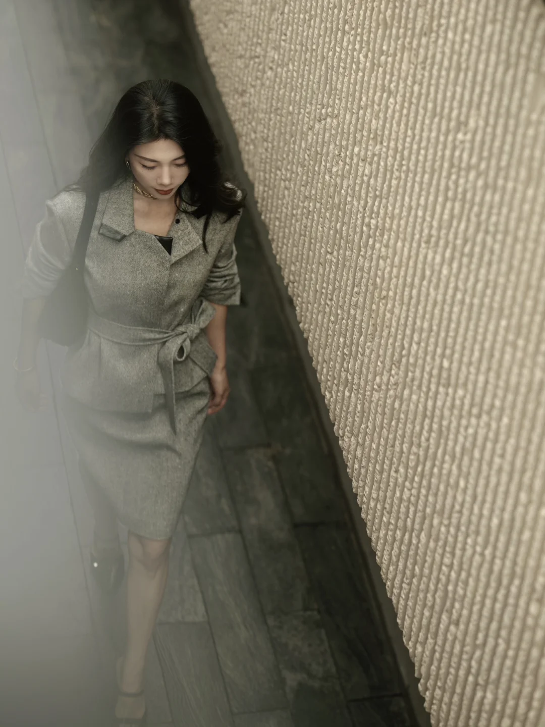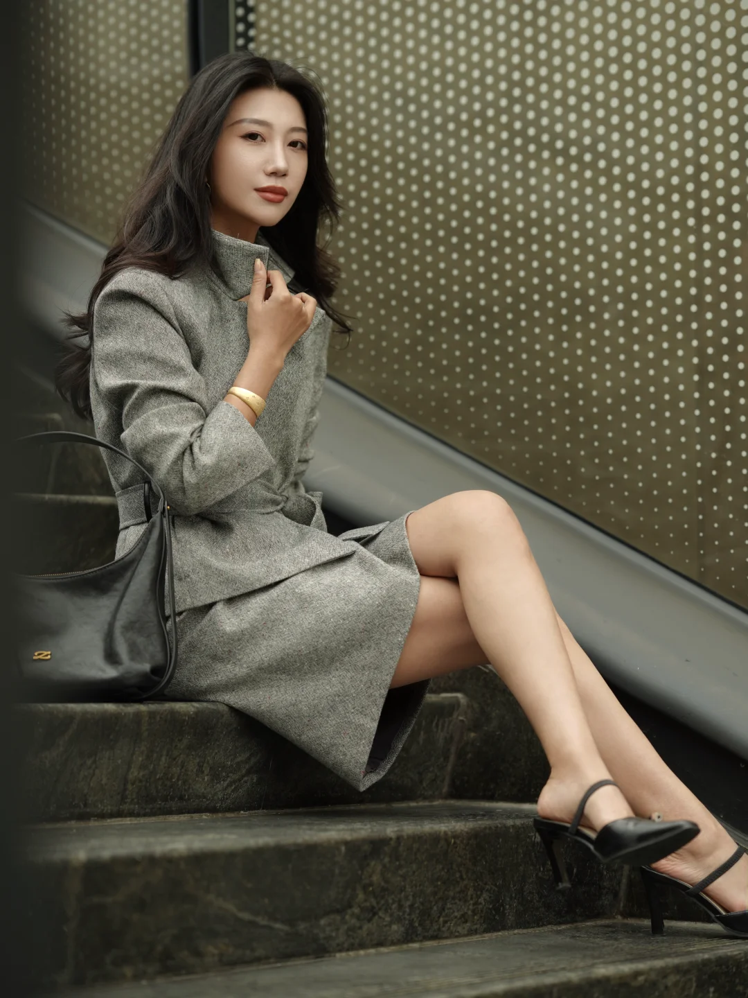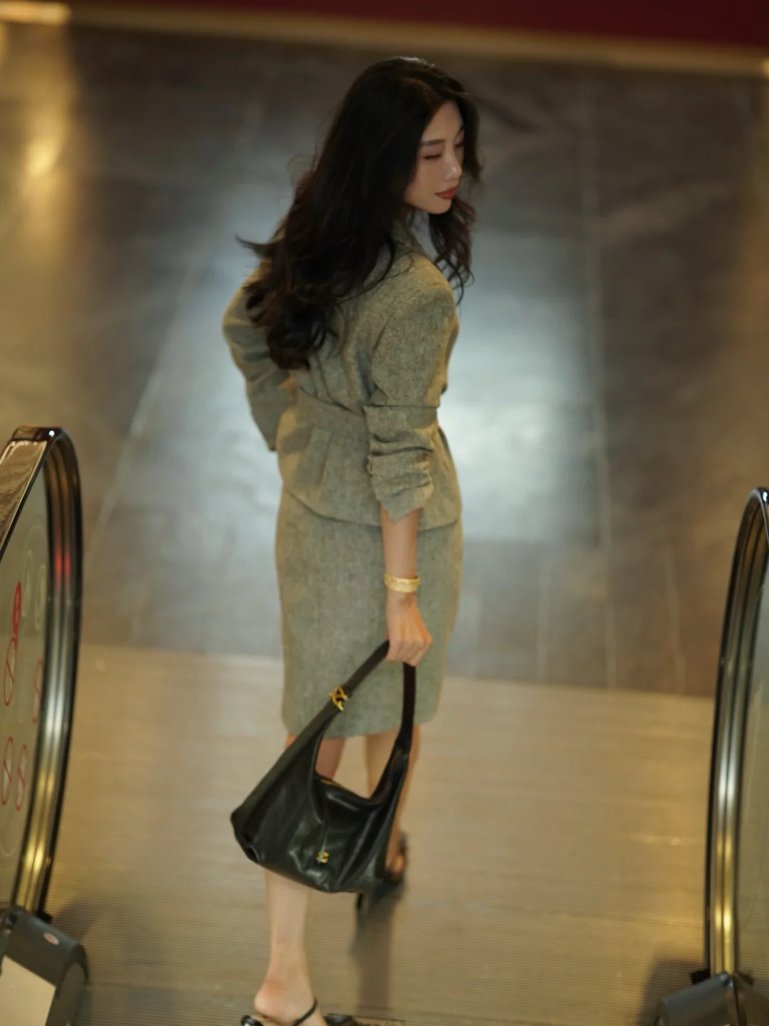 这套灰色岗花羊毛套装,穿上身的瞬间,那种感觉就来了——不是那种被束缚的正式感,而是一种“我准备好了”的从容。