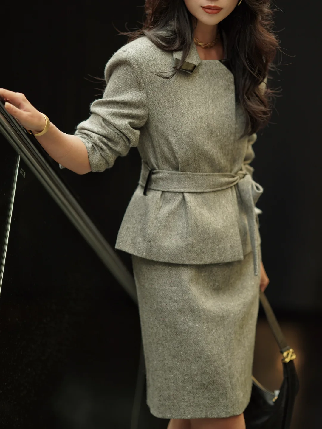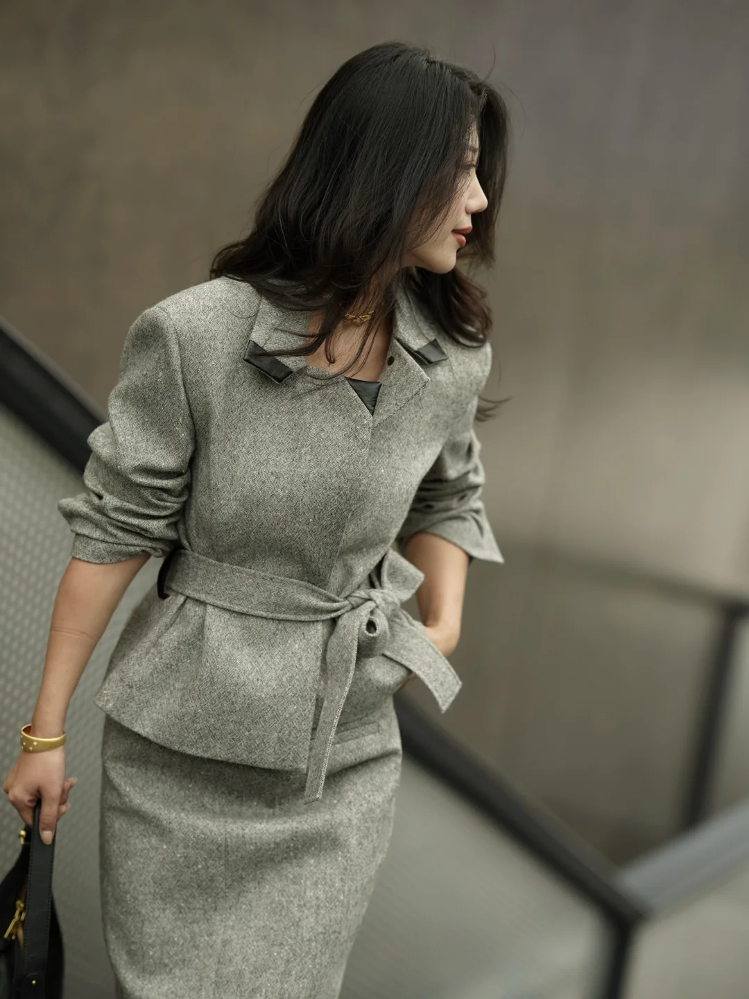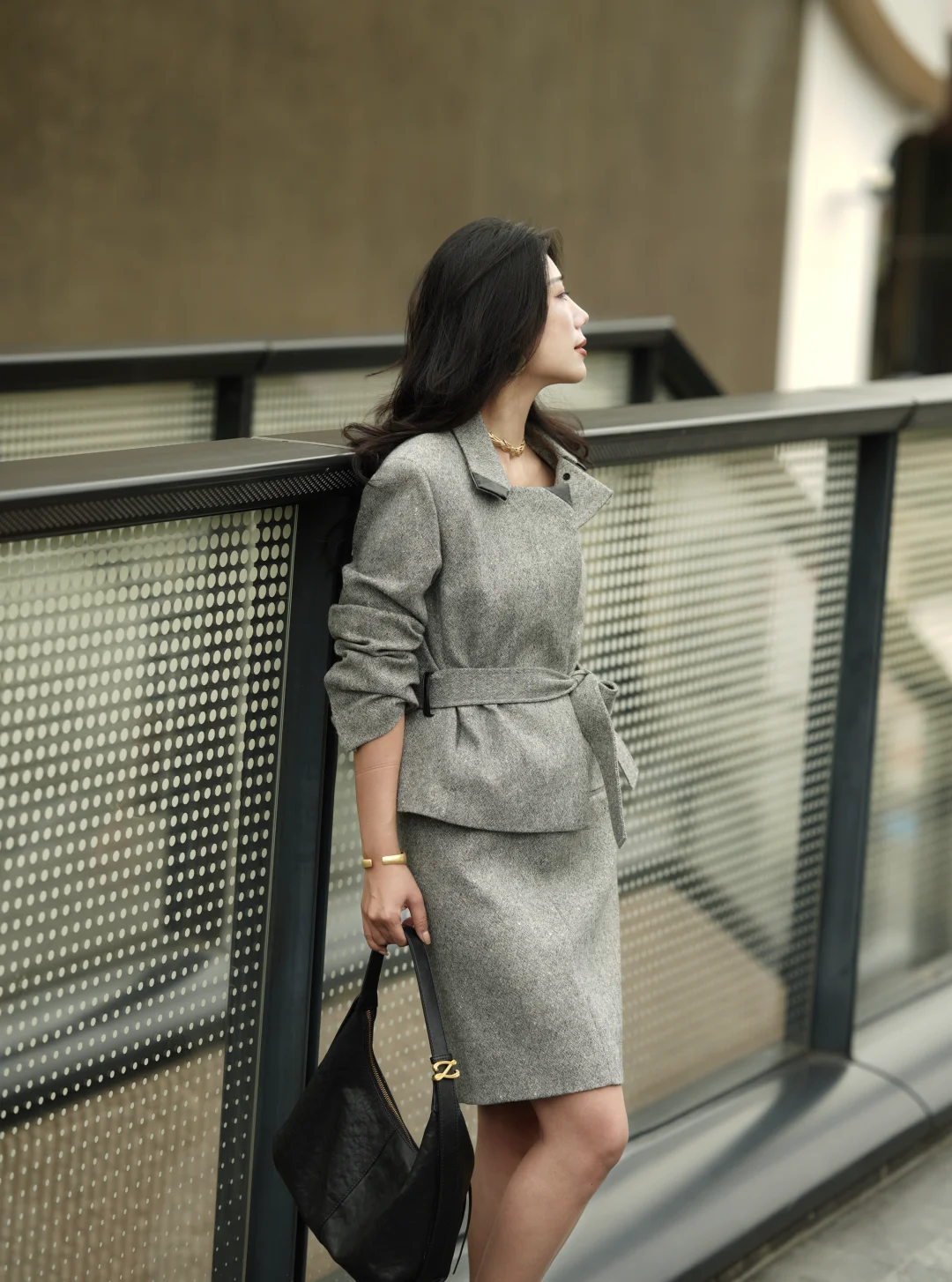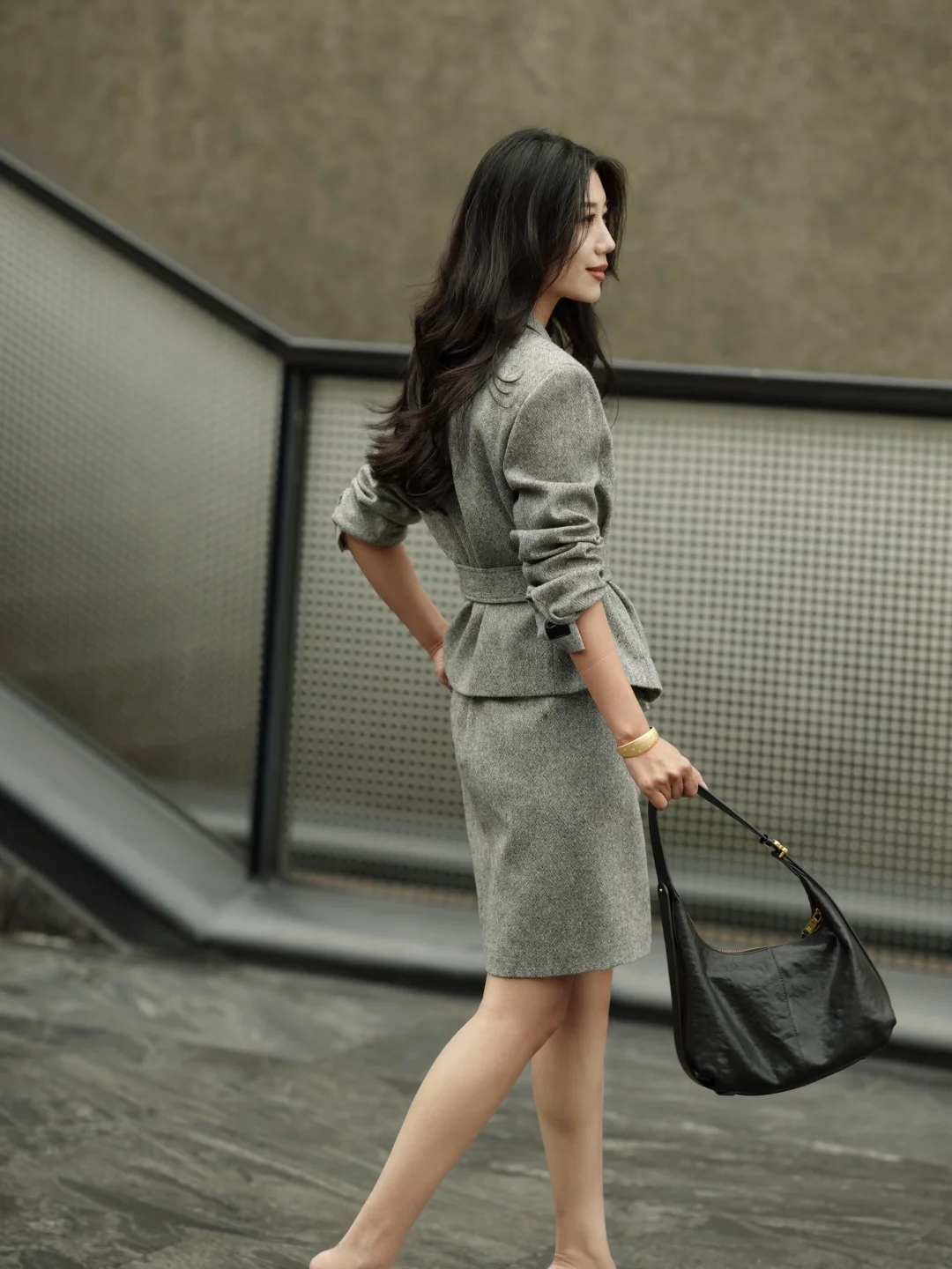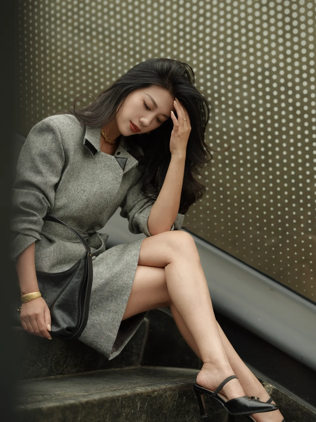 这套灰色岗花羊毛套装,穿上身的瞬间,那种感觉就来了——不是那种被束缚的正式感,而是一种“我准备好了”的从容。
