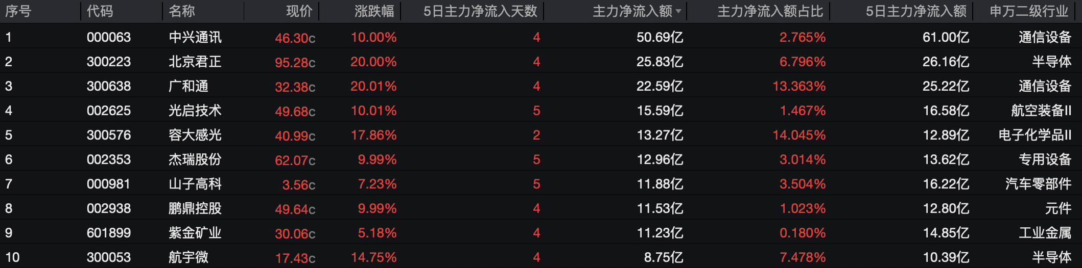 上证报中国证券网讯(记者窦世平)Wind数据显示,12月1日,当日主力资金净流入额排名前十个股包括中兴通讯、北京君正、广和通、光启技术、容大感光、杰瑞股份、山子高科、鹏鼎控股、紫金矿业、航宇微。净流入金额均超8亿元,最高为中兴通讯,净流入额超50亿元。其中,中兴通讯、北京君正、广和通、航宇微等属于通信设备或半导体板块,两个板块当日资金流入均超70亿元。
