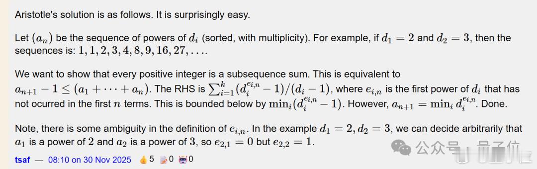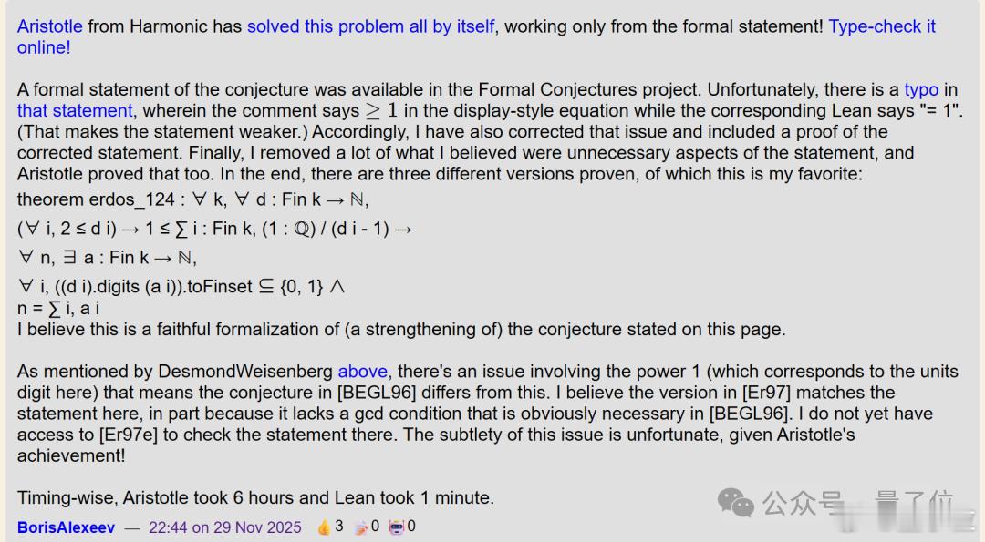 6小时破30年数学难题,AI版“亚里士多德”一夜成名。社交媒体上已经吵翻了——Harmonic的数学AI模型,用6小时独立证明了Erdos问题 124(简易版),而这个问题被数学界搁置了近三十年。消息最先由微软前AI副总裁、现OpenAI AGI研究员Bubeck公布,陶哲轩也亲自下场围观,甚至和Gemini、ChatGPT 的深度研究工具对比了一下,结论是:这题Harmonic模型证明得更好。不过补一句:它证明的不是严格原版,而是简化版。原题要求更严(不能用 1,还要满足gcd条件),三十年来只在 {3,4,7} 这种特殊集合上成立。而放宽条件后(允许用 1、无需gcd),Harmonic给出了完整证明,而且已经通过Lean形式化验证。更戏剧性的是:原本的形式化项目中公式条件写错了,注释是≥1,代码却是=1,只覆盖了“刚好等于1”的情况。研究者修正后,删掉了不必要限制,AI才成功证明了这个更准确的版本。结论:难题原版依然悬着,简易版被AI拿下。但数学圈的兴奋点不在这里,而在于—— “Vibe证明时代来了。”Harmonic联创直接喊话:就像当初有了Vibe Coding,现在数学也要进入“靠 vibe 找路子”的新阶段。要知道,Harmonic这家公司才成立两年,目标就是打造“全球最强数学推理引擎”。CEO Tudor Achim是CMU/斯坦福背景,联合创始人还是Robinhood CEO Vlad Tenev。Harmonic刚刚拿下1.2亿美元C轮融资,估值14.5亿美元。他们的旗舰模型Aristotle(“亚里士多德”)已经在2025 IMO里形式化解决了5道奥赛题,这次证明124用的也是升级版Aristotle,推理能力更狠。从奥赛题,到30年数学难题,再到Lean的形式化验证,“AI证明数学”这条线,正从概念走向现实。很多数学家都在说:以前觉得AI做证明像科幻,现在开始怀疑——下一批百年难题,会不会先被AI解掉?Anyway,时代的箭已经射出去,回不来了。数学AI