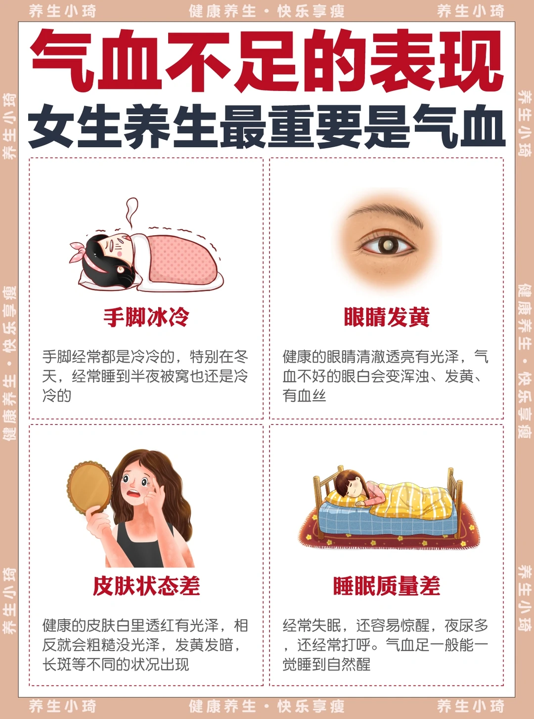 [清单R]气血在人体生命活动中占有很重要的地位 [清单R]气血不足时,可以从以下8个方向看出来⬇️ [一R] 白头发、脱发 [二R] 指甲没有月牙或少月牙,出现竖纹 [三R] 牙龈萎缩、牙齿松动 [四R] 姨妈颜色淡,周期短 [五R] 手脚冰冷,特别冬天,经常睡到半夜还是冷的 [六R] 眼睛发黄、浑浊,有血丝 [七R] 皮肤粗糙没光泽,发黄发暗 [八R] 经常失眠,多梦