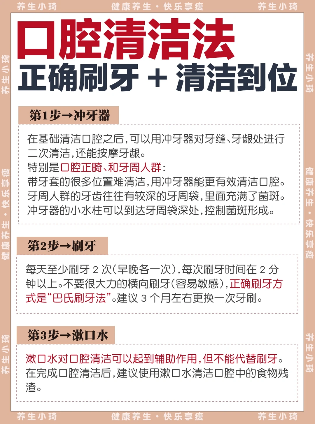 [二R]每天刷牙:每天至少刷牙2次(早晚各一次),每次刷牙时间在2分钟以上、正确刷牙方式是“巴氏刷牙法”,刷牙可以清除牙齿表面的污垢