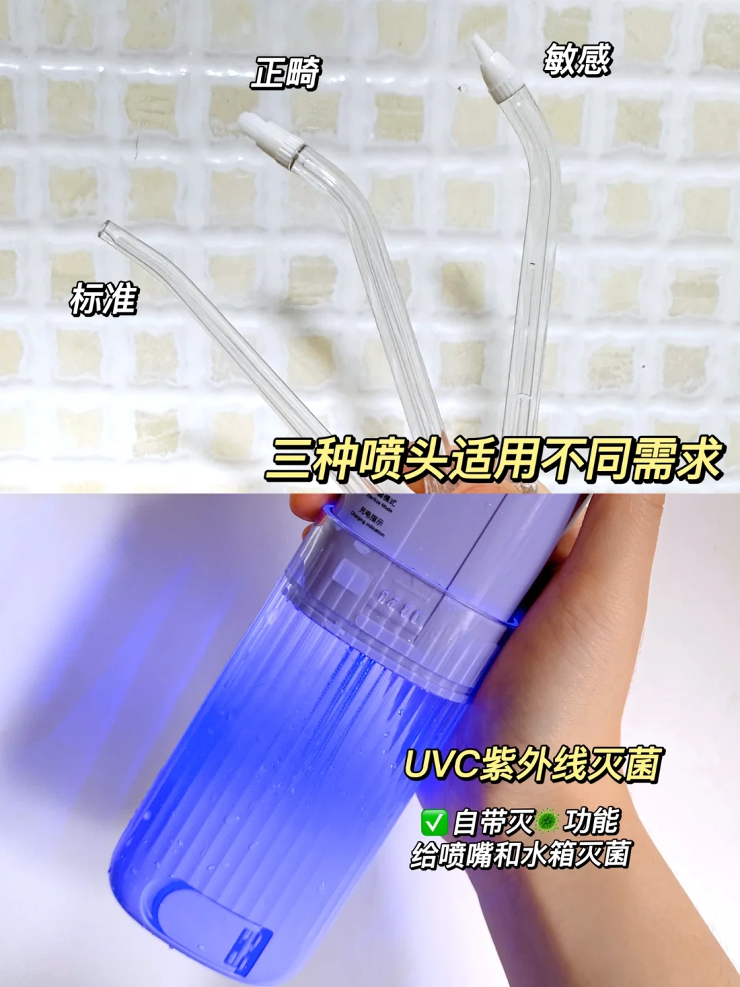 它还有杀菌灭菌的作用,喷嘴也可以放进去消毒,避免细菌滋生。再也不用担心冲牙器发霉发臭啦!