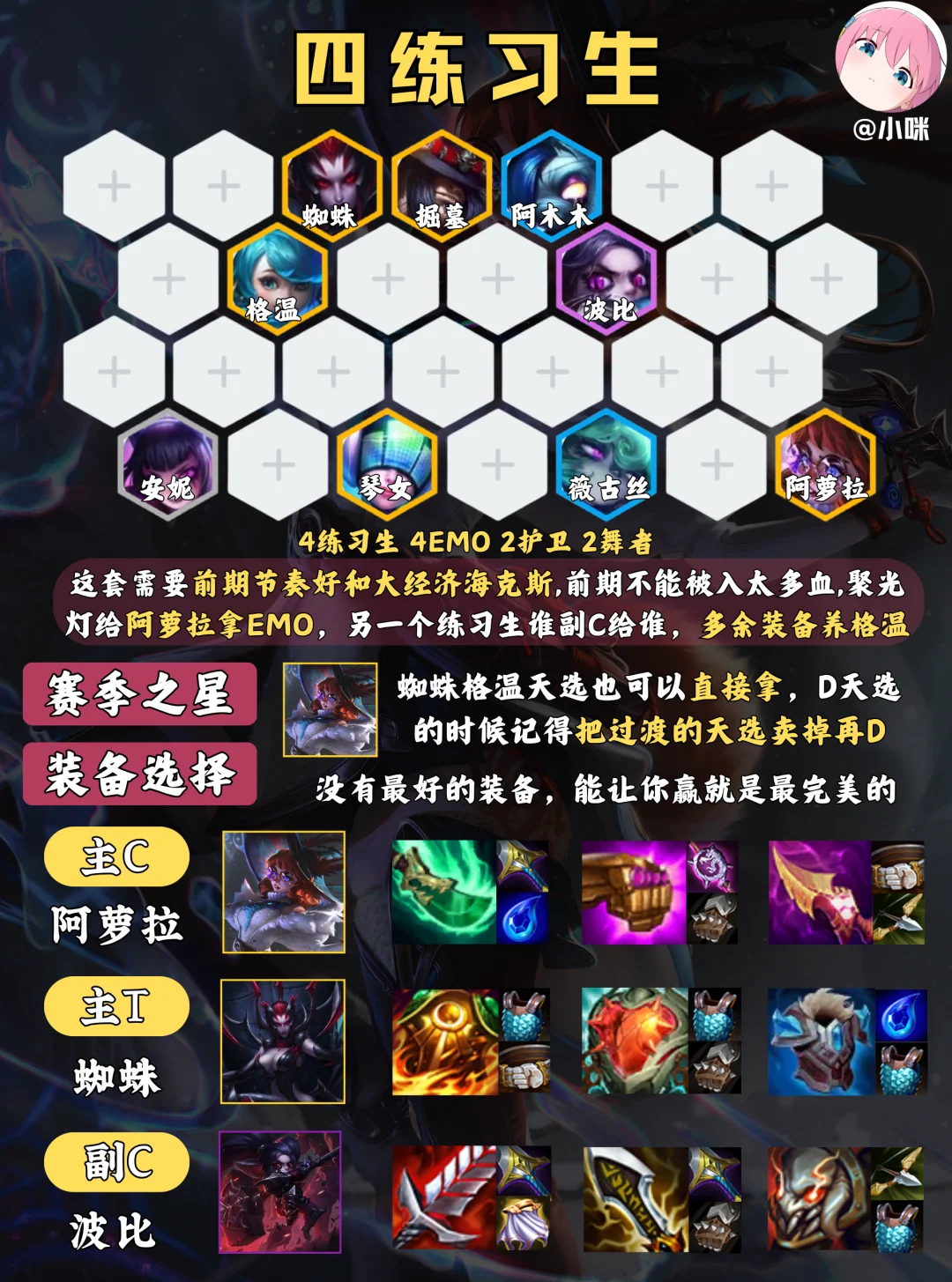 2️⃣阶段2-1拉4,2-5拉5,前期萨勒芬妮天选带阿萝拉装备过渡,前期得走连胜不能被断,血量经济都得好,选秀优先抢阿萝拉装备