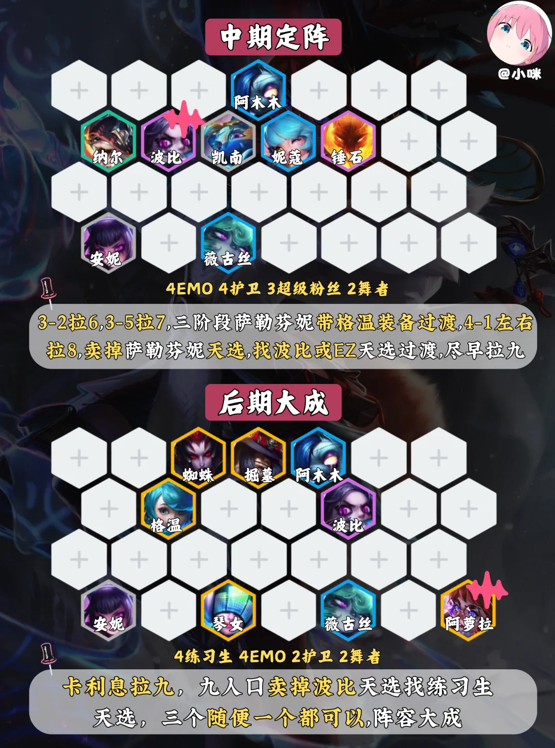 3️⃣阶段3-2拉6,3-5拉7,三阶段还是用萨勒芬妮天选过渡,这个阶段一二费赌狗阵容发力期,会连败不用慌,尽量多换怪保血量