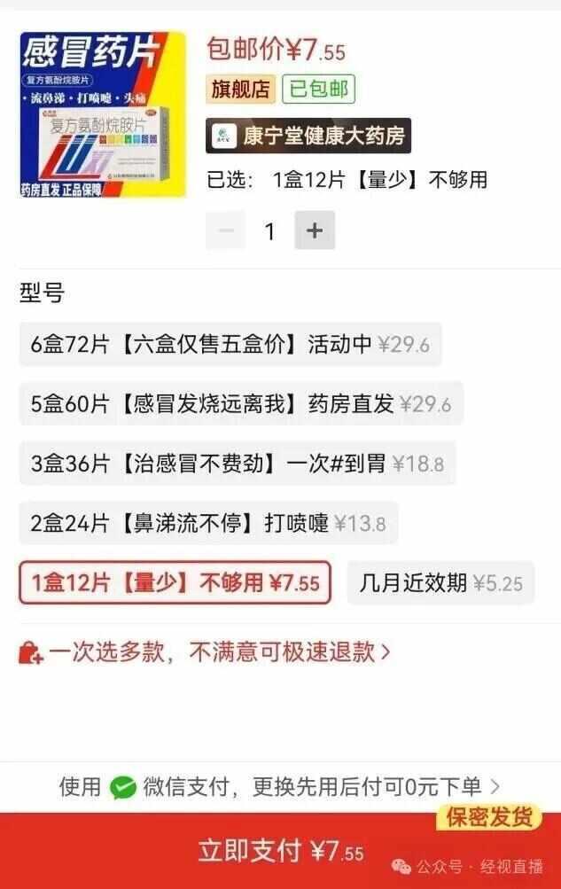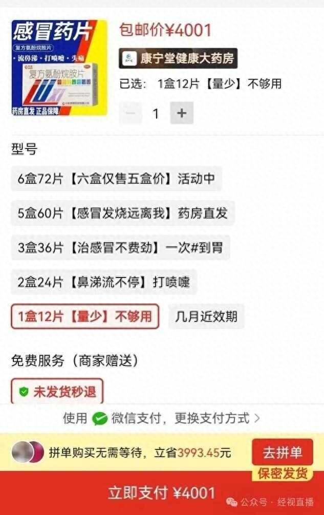 近日,有网友发帖称,其在网购平台“康宁堂健康大药房旗舰店”内发现一款感冒药价格悬殊:一盒12片的鲁西复方氨酚烷胺片,若单独购买标价高达4001元,而选择拼单则仅需7.55元,差价超过500倍,引发关注。