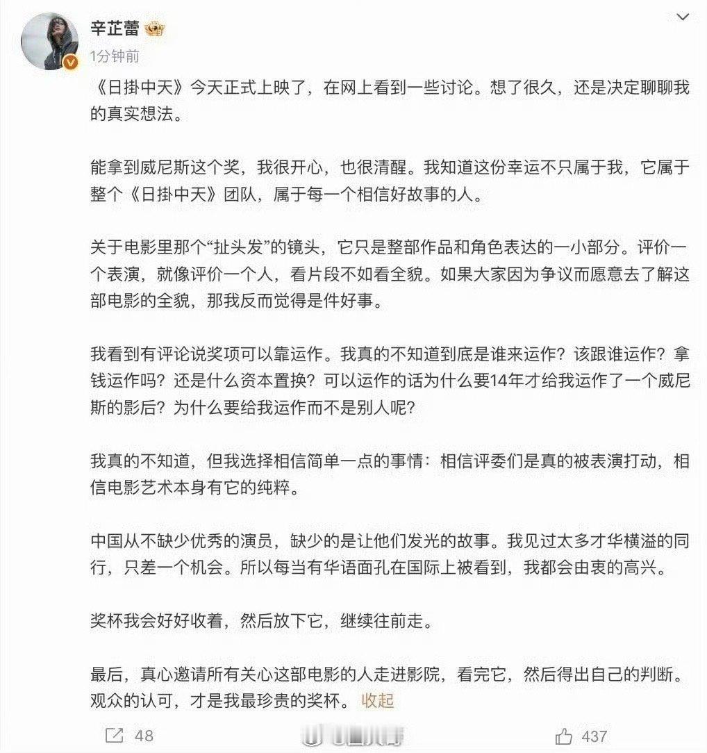 郝蕾澄清朋友圈说的不是辛芷蕾。辛芷蕾威尼斯影后的头衔,再次被正名了。不过郝蕾那么