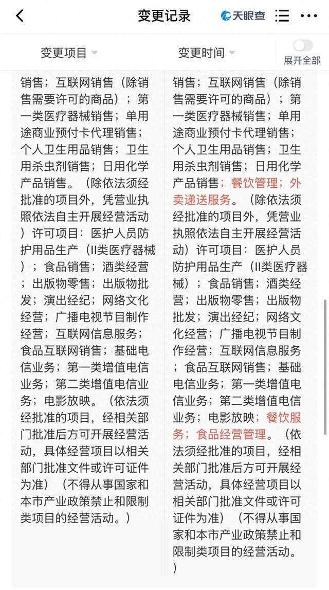 天眼查APP显示,11月27日,东方甄选(北京)科技有限公司发生工商变更,经营范围新增餐饮管理、外卖递送服务、餐饮服务业务。