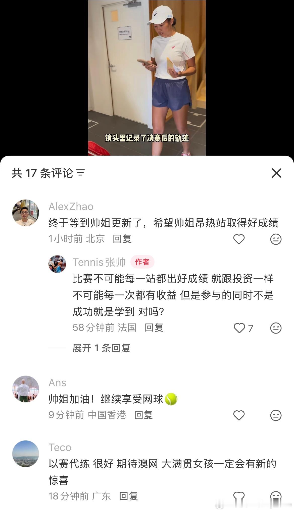 张帅抵达法国,发布动态“今天不努力工作 明天就努力找工作”另外回复网友评论:“比赛不可能每一站都出好成绩 就跟投资一样不可能每一次都有收益 但是参与的同时不是成功就是学到 对吗?”这才是体育教导的价值观 网球talking大会