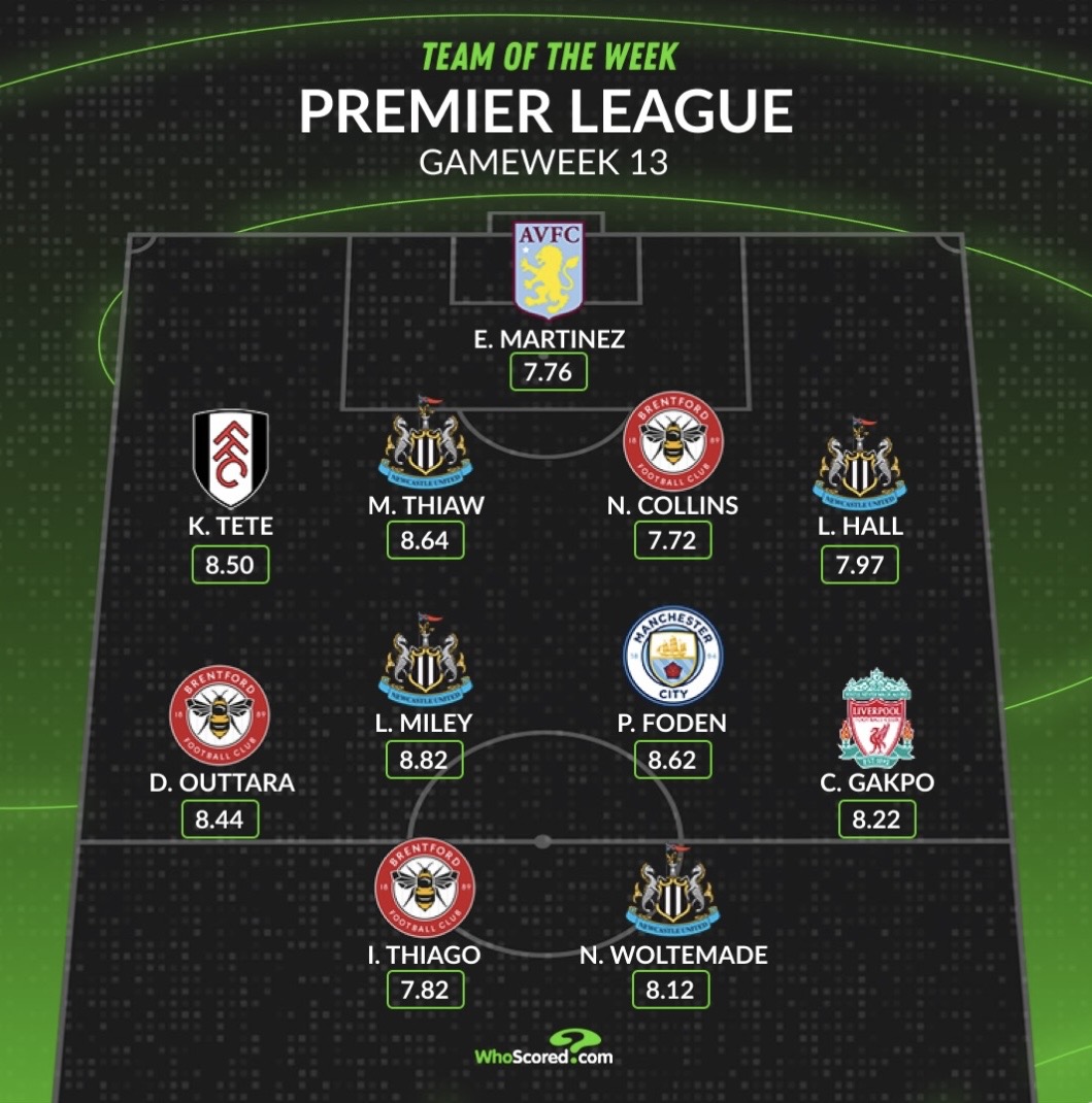 虎扑12月01日讯英超第13轮的比赛全部结束,WhoScored盘点本轮评分最高阵容: