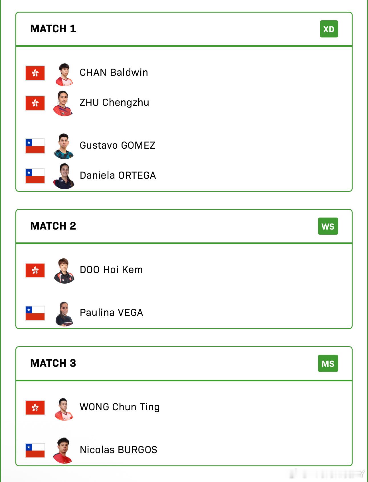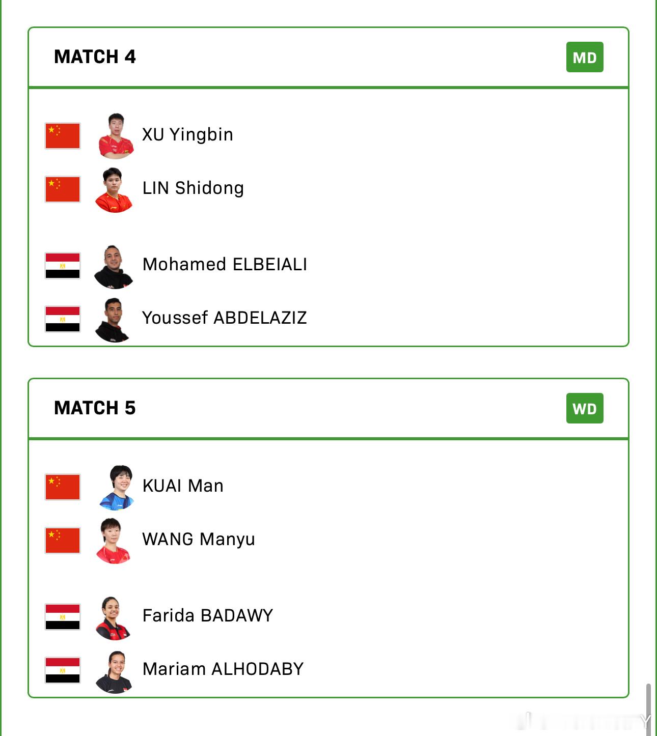 2025混合团体世界杯G1组中国VS埃及林诗栋/蒯曼VS穆斯塔法/玛尔娃孙颖莎VS玛利亚姆王楚钦VS尤瑟夫林诗栋/徐瑛彬VS艾尔贝阿里/尤瑟夫蒯曼/王曼昱VS巴达维/玛利亚姆 中国香港VS智利陈颢桦/朱成竹VS戈麦斯/丹妮拉杜凯琹VS维嘉黄镇廷VS博格斯