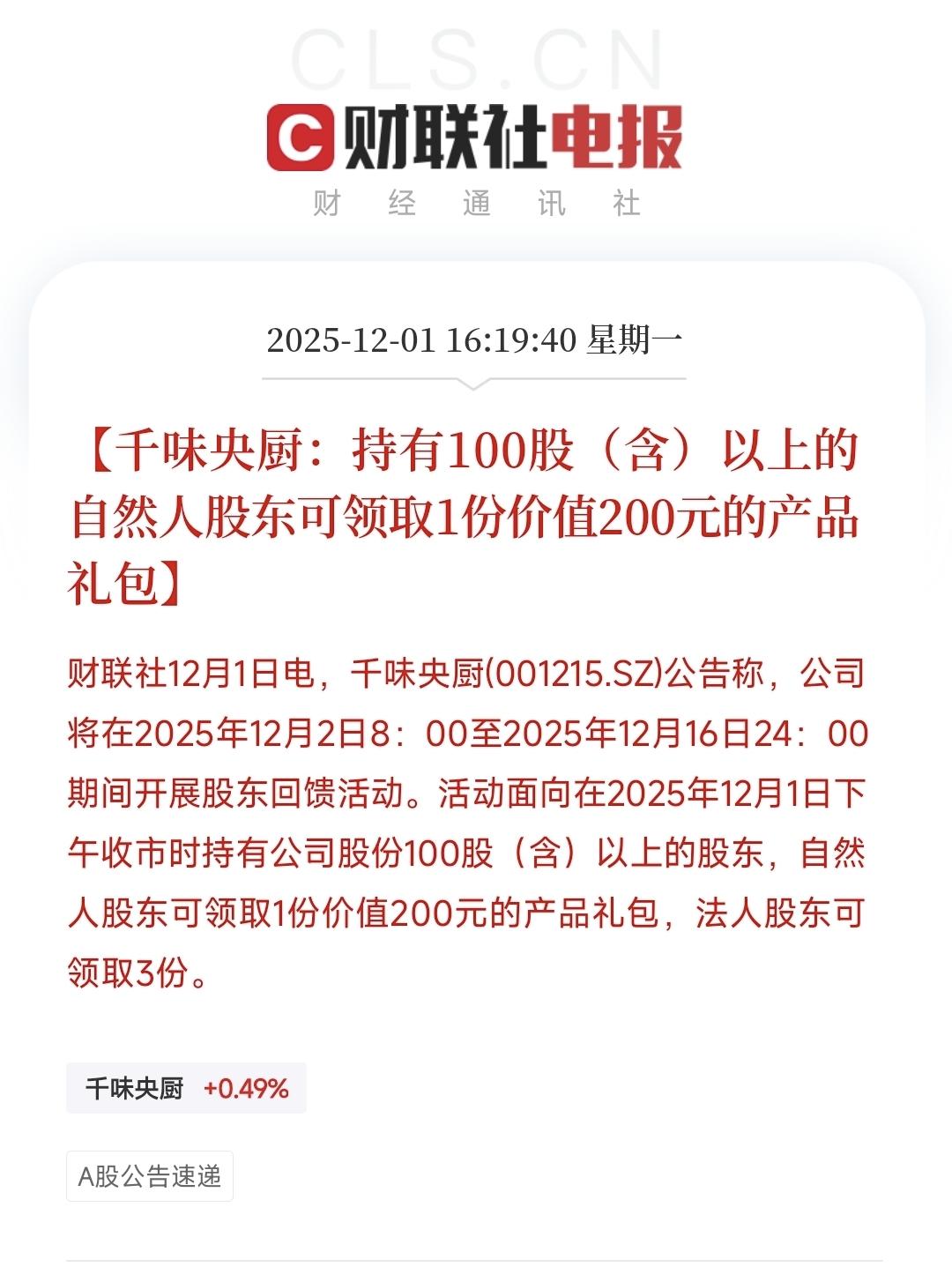 得散户者得天下,峨眉山A因推出持股500股以上免峨眉山门票的活动,今日开盘即涨停。 千味厨房今日也宣布12月1日收市持股100股以上即可领取价值200元的产品礼包。 那接下来是不是各大消费企业都要卷起来了,白酒公司送白酒,旅游公司送景区门票和酒店免费住宿,饮食公司送吃的…… 最后,如果黄金公司送黄金……好像也不是不可以,高低得干涨停。