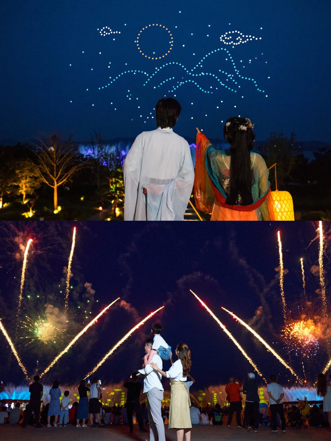 在景区内可以看到孔明灯+烟花+无人机表演,