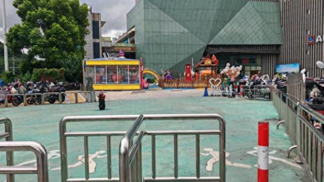 记者前往现场调查,绕着商场步行一周,发现这里几乎是一个被各种铁栏杆“里三层外三层”全面包围的商场。在人流通行最多的商场1号门外广场,这里被划分成不同区域:最内侧是儿童游乐区,中间区域分成了“外卖专用停车区”与“电瓶车和自行车停车区”,最外侧则是人行道,停满了共享单车,三块区域间用间隔柱隔开,仅留很小的缝隙,行人需要侧身而过,也未留出无障碍通道。在围栏之外的人行道上,停满了各种非机动车,留给行人通行的距离极其狭窄,盲道也被淹没在车海之中。很明显,这些间隔柱实现了广场上人车分流的目的,将非机动车挡在广场之外,但同时也形成了障碍,将需要使用无障碍通道的市民挡在了商场之外。