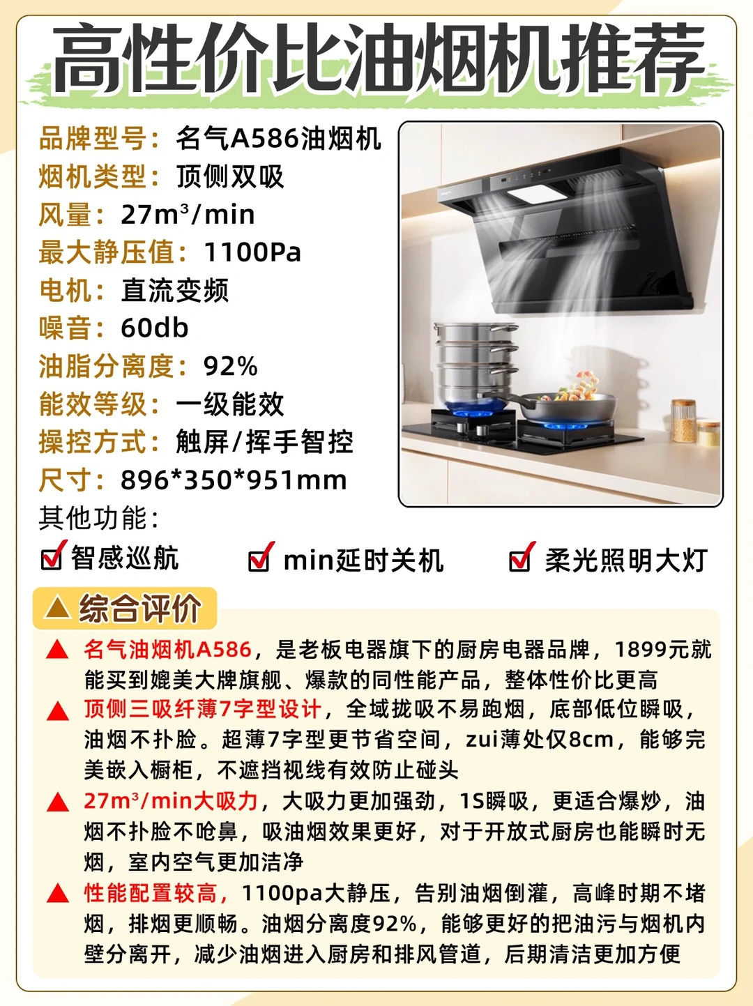 性价比方面:对于追求性价比的朋友,还可以关注大品牌旗下的经济型子品牌。例如老板旗下的名气油烟机,质量、性能、服务有保障的同时,价格更为亲民,具有更高的性价比