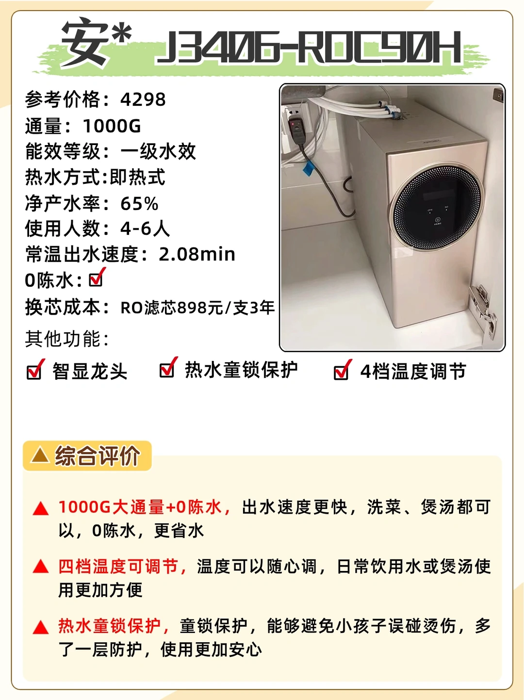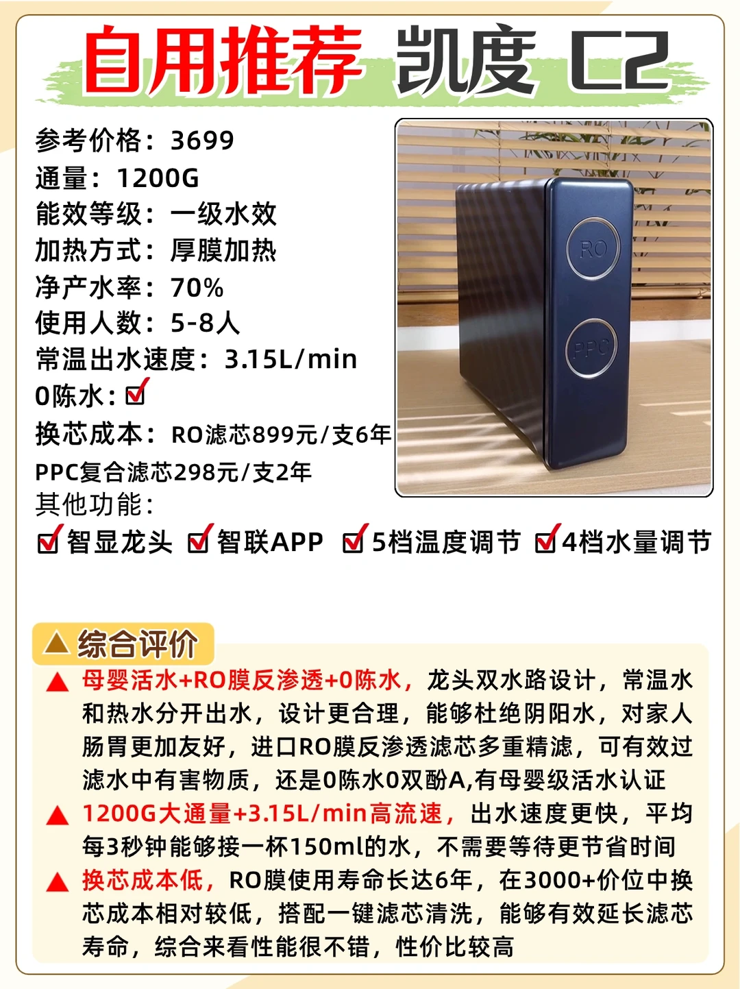 1200G大通量加3.15L/min高流速,出水速度更快,更节省时间,有母婴级活水认证,饮用水更加放心,进口RO膜使用寿命长达6年,不用频繁更换滤芯更省钱,整体来看性价比很高!