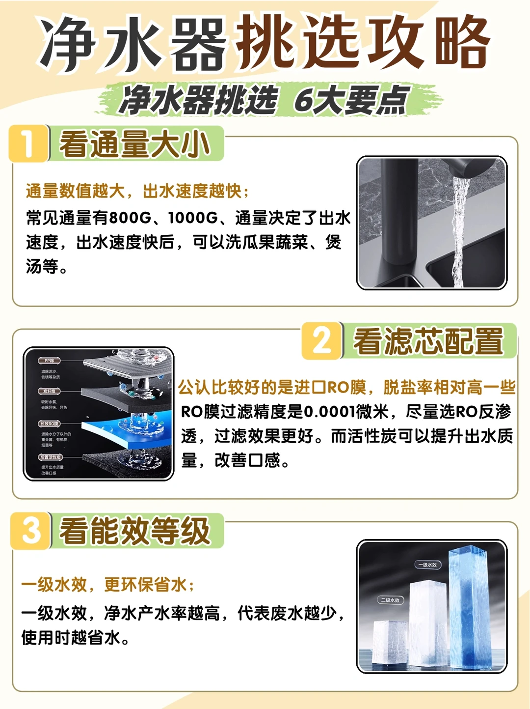 1⃣通量大小:通量越大越好,通量决定了出水速度,通量越大出水速度越快,日常接水更节省时间