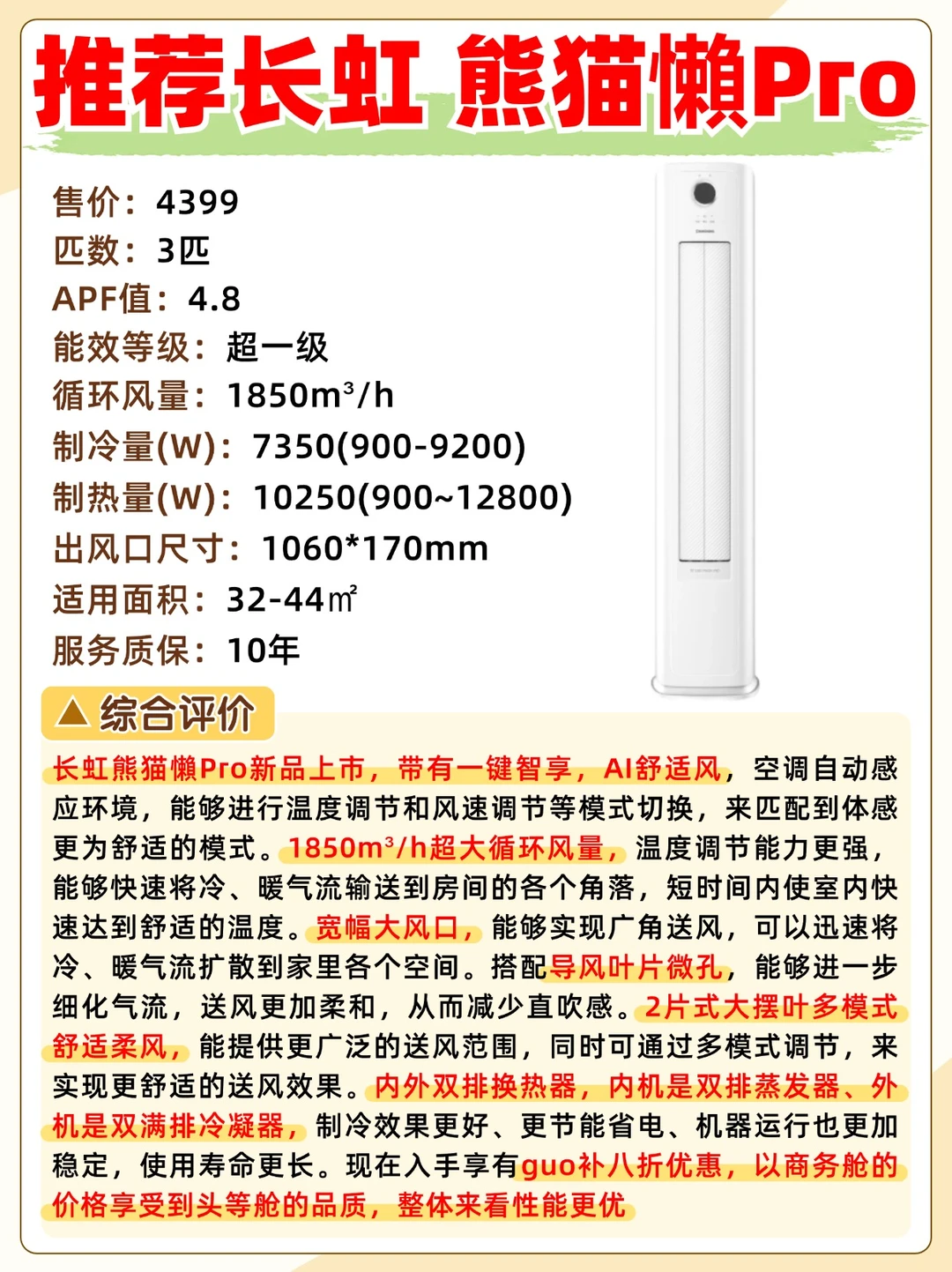 长虹熊猫懒Pro新品上市,带有一键智享,AI舒适风,可进行温度调节和风速调节等模式切换。拥有1850m³/h超大循环风量搭配2片式大摆叶+宽幅大风口能够快速将冷、暖气流输送到房间的各个角落。设有导风叶片微孔,送风更加柔和。还配备了双满排铜管,制冷效果好的同时更节能省电4k这个配置整体来看性价比很高了。现在入手享有guo补八折优惠,以商务舱的价格享受到头等舱的品质,整体来看性能更优,而且还有10年包修,省心