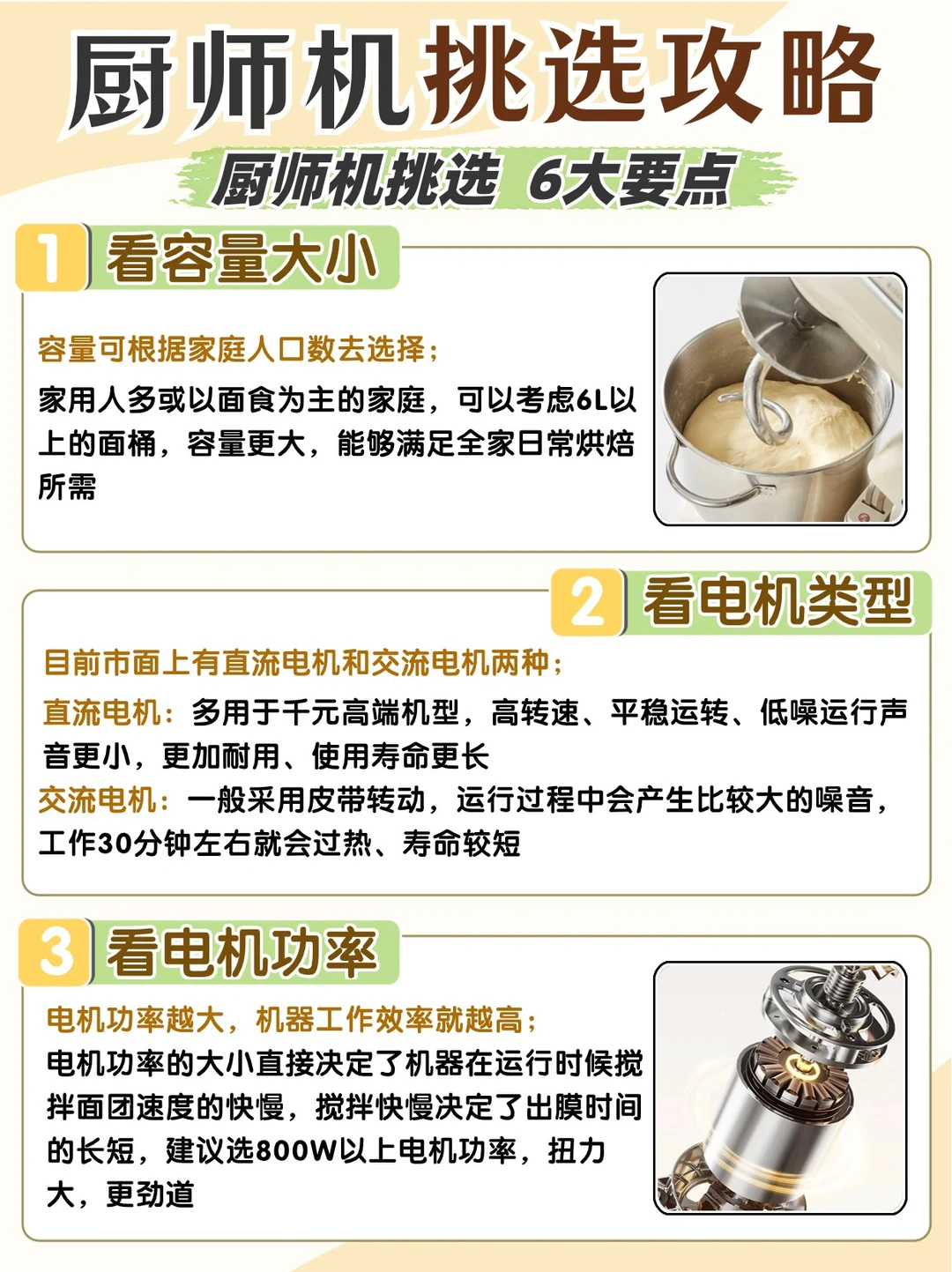 电机功率的大小直接决定了机器在运行时候搅拌面团速度的快慢,搅拌快慢决定了出膜时间的长短,建议选800W以上电机功率,扭力大,更劲道