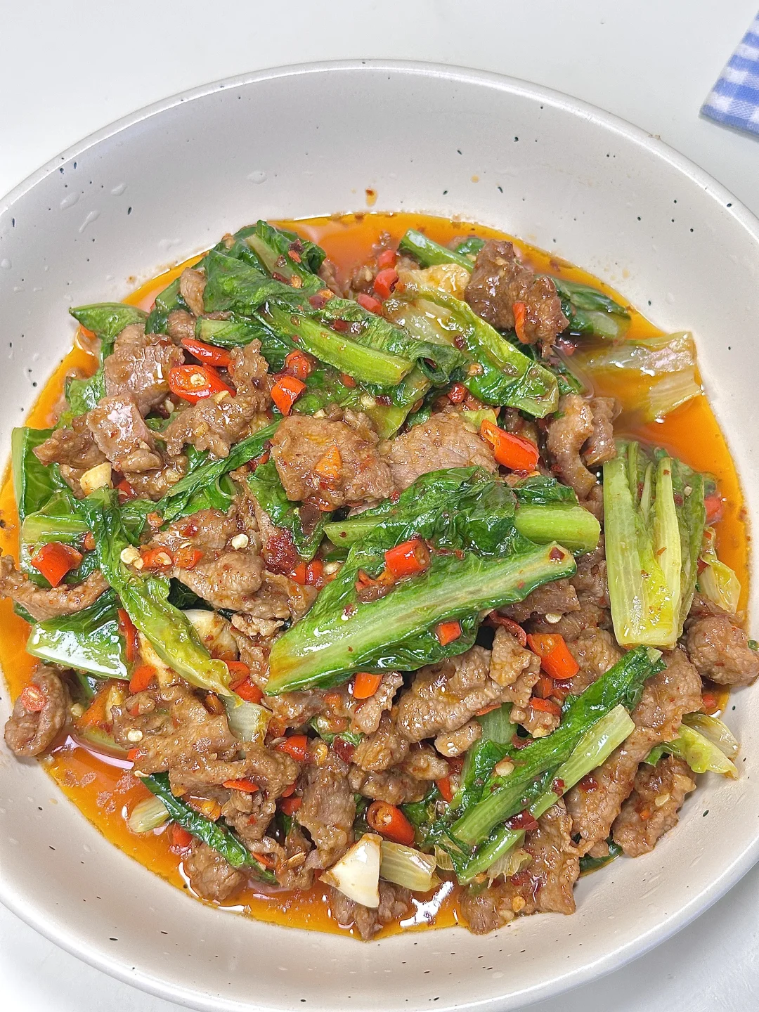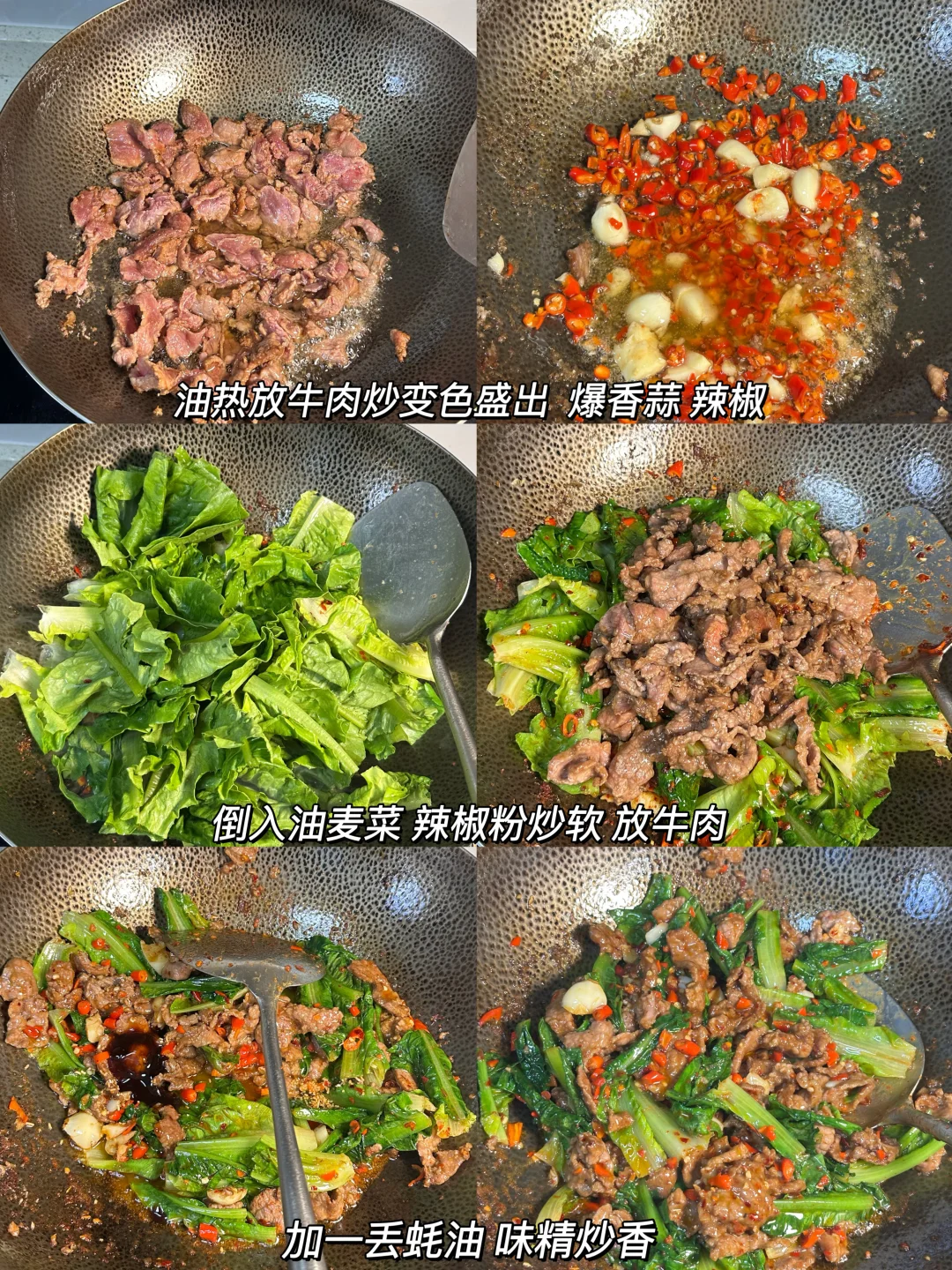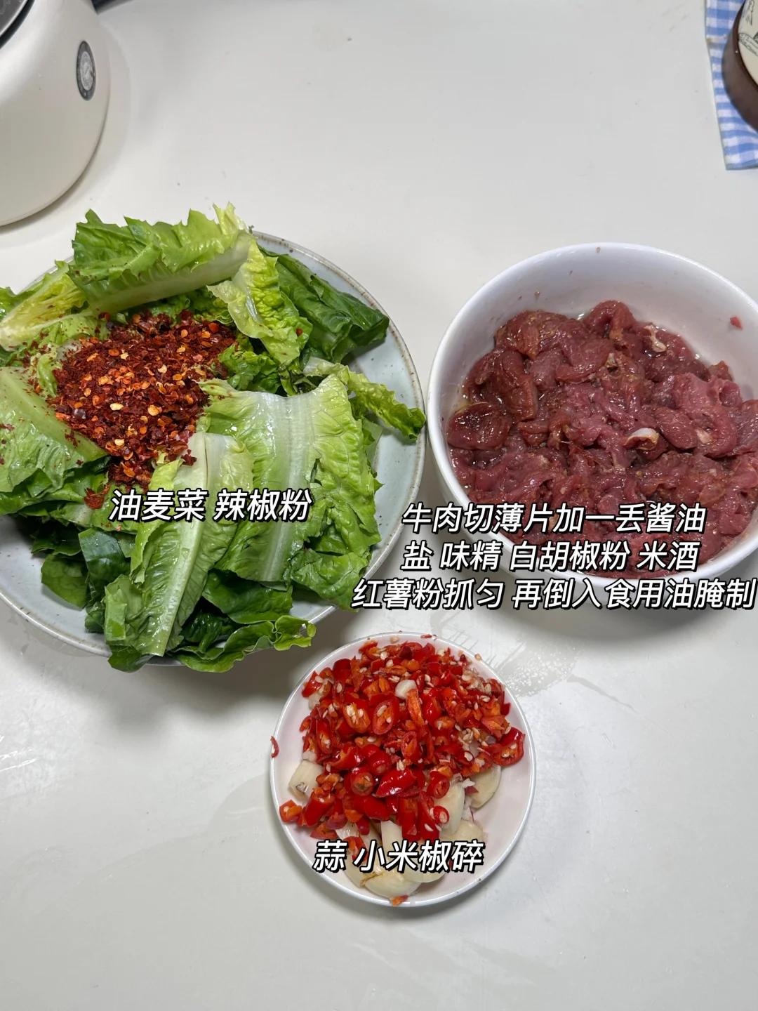 利村牛肉 按头安利!!巨巨巨好吃 ,脆嫩的油麦菜搭配鲜辣的牛肉吃不腻的下饭菜。 ✨食材:牛肉 油麦菜 蒜 小米椒碎 1️⃣:牛肉逆着纹路切薄片,加一丢酱油、盐、胡椒粉、米酒、红薯粉抓匀,再倒入食用油拌匀腌制10分钟。 锅里倒油烧热放牛肉炒变色盛出 ,就着底油爆香蒜 小米椒碎,放油麦菜辣椒粉炒软,倒入牛肉加一丢蚝油 味精炒香。 好好吃饭呀🖖🏻