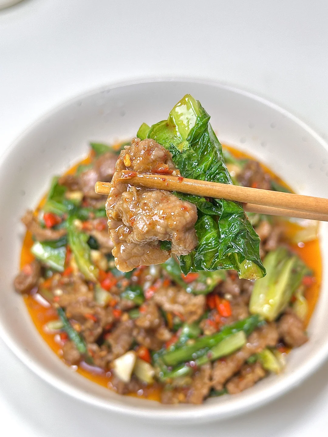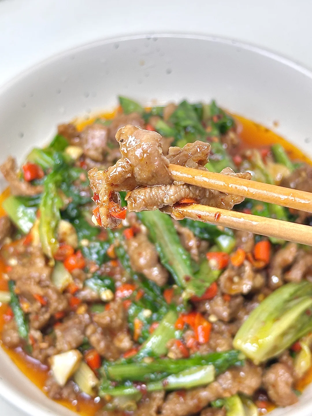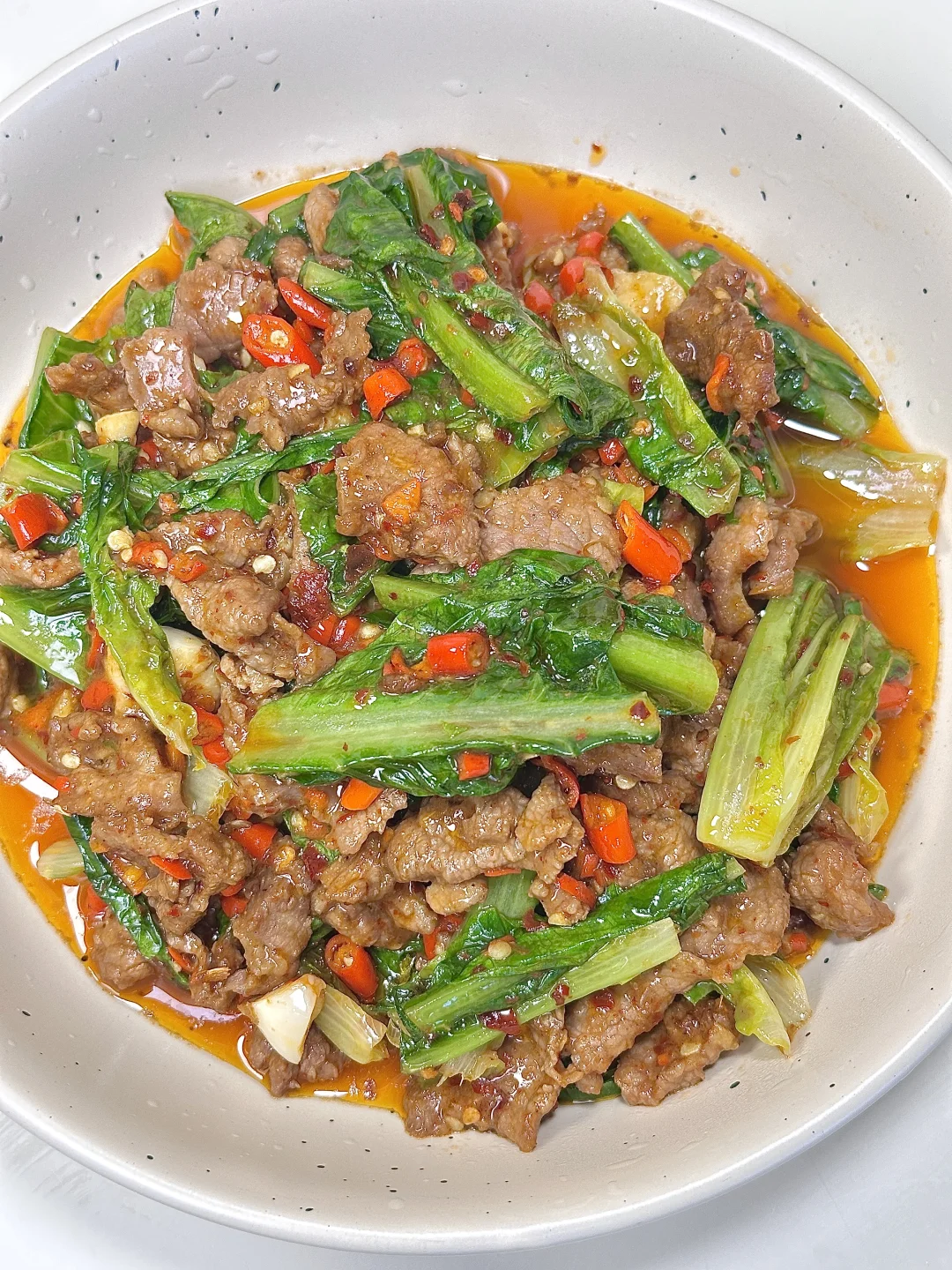 利村牛肉 按头安利!!巨巨巨好吃 ,脆嫩的油麦菜搭配鲜辣的牛肉吃不腻的下饭菜。 ✨食材:牛肉 油麦菜 蒜 小米椒碎 1️⃣:牛肉逆着纹路切薄片,加一丢酱油、盐、胡椒粉、米酒、红薯粉抓匀,再倒入食用油拌匀腌制10分钟。 锅里倒油烧热放牛肉炒变色盛出 ,就着底油爆香蒜 小米椒碎,放油麦菜辣椒粉炒软,倒入牛肉加一丢蚝油 味精炒香。 好好吃饭呀🖖🏻