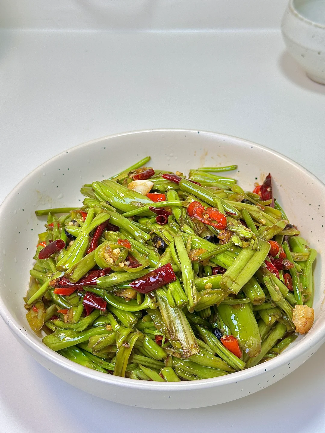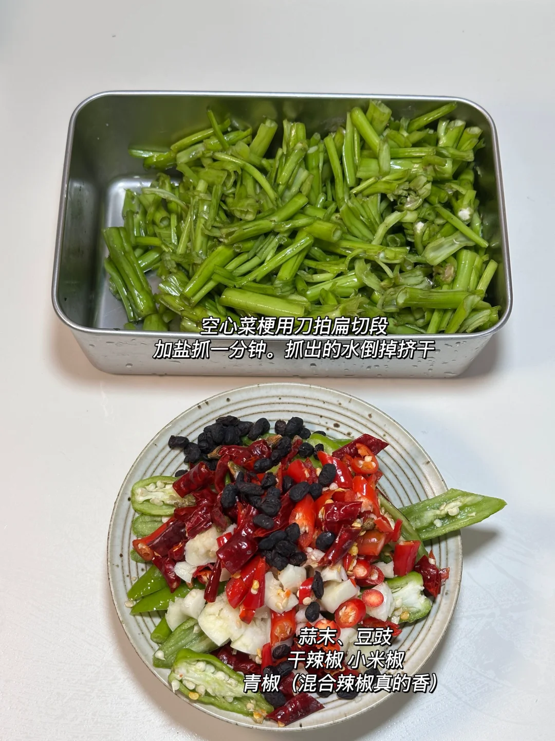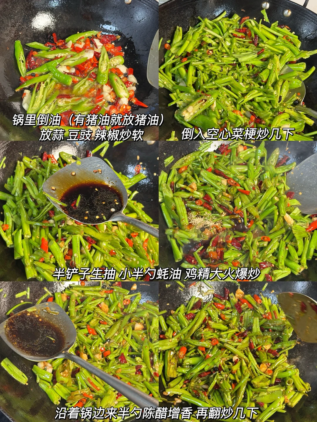 最近江西人餐桌上是不是几乎天天都有空心菜呀~菜叶清炒 梗子放辣椒爆炒,再煮一锅白粥 不存在没胃口的🤤夏日消暑风味集 ✨食材:空心菜梗 蒜🧄 豆豉 干辣椒 小米椒 青椒 1️⃣:空心菜梗用刀背拍扁,再切段,放碗里加盐抓捏一分钟,里面会出水 把水倒掉。锅里倒油烧热 放蒜 豆豉 辣椒炒断生,放空心菜梗炒几下,加半铲子生抽 半勺蚝油、鸡精爆炒入味,起锅前沿着锅边来点陈醋增香丰富口感 (记得沿着锅边放 呛香)再炒几下就可以啦。 好好吃饭呀🖖🏻