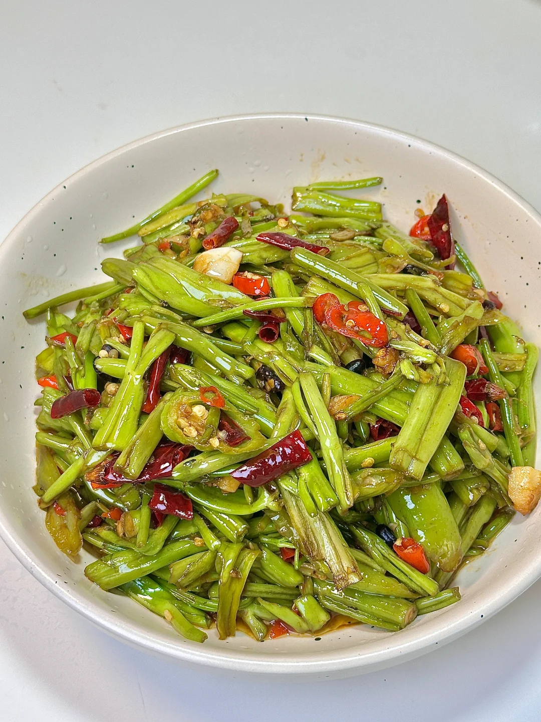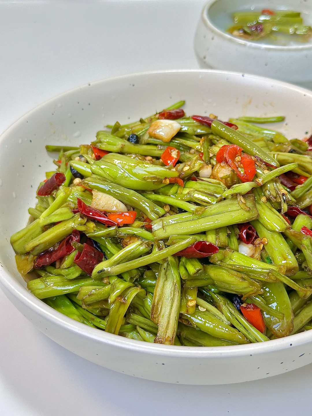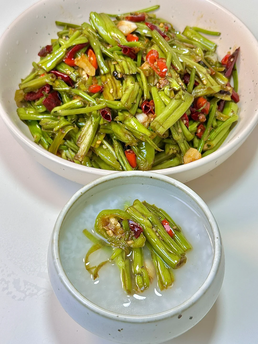 最近江西人餐桌上是不是几乎天天都有空心菜呀~菜叶清炒 梗子放辣椒爆炒,再煮一锅白粥 不存在没胃口的🤤夏日消暑风味集 ✨食材:空心菜梗 蒜🧄 豆豉 干辣椒 小米椒 青椒 1️⃣:空心菜梗用刀背拍扁,再切段,放碗里加盐抓捏一分钟,里面会出水 把水倒掉。锅里倒油烧热 放蒜 豆豉 辣椒炒断生,放空心菜梗炒几下,加半铲子生抽 半勺蚝油、鸡精爆炒入味,起锅前沿着锅边来点陈醋增香丰富口感 (记得沿着锅边放 呛香)再炒几下就可以啦。 好好吃饭呀🖖🏻