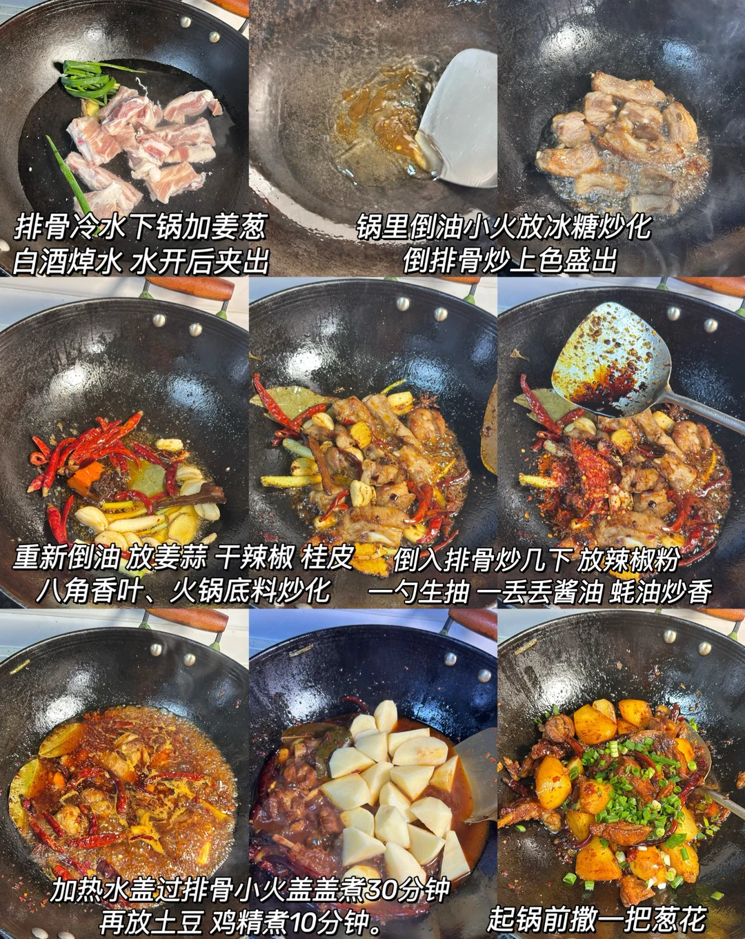 1⃣:排骨冷水下锅加姜葱 料酒焯水。水开后夹出来,锅里倒油放冰糖小火炒化 放排骨炒上色盛出。重新倒油放姜蒜,葱白、香叶桂皮八角、干辣椒 火锅底料小火炒化。倒入排骨炒匀,加一勺辣椒粉 、一勺生抽 蚝油 、一丢丢酱油炒香。