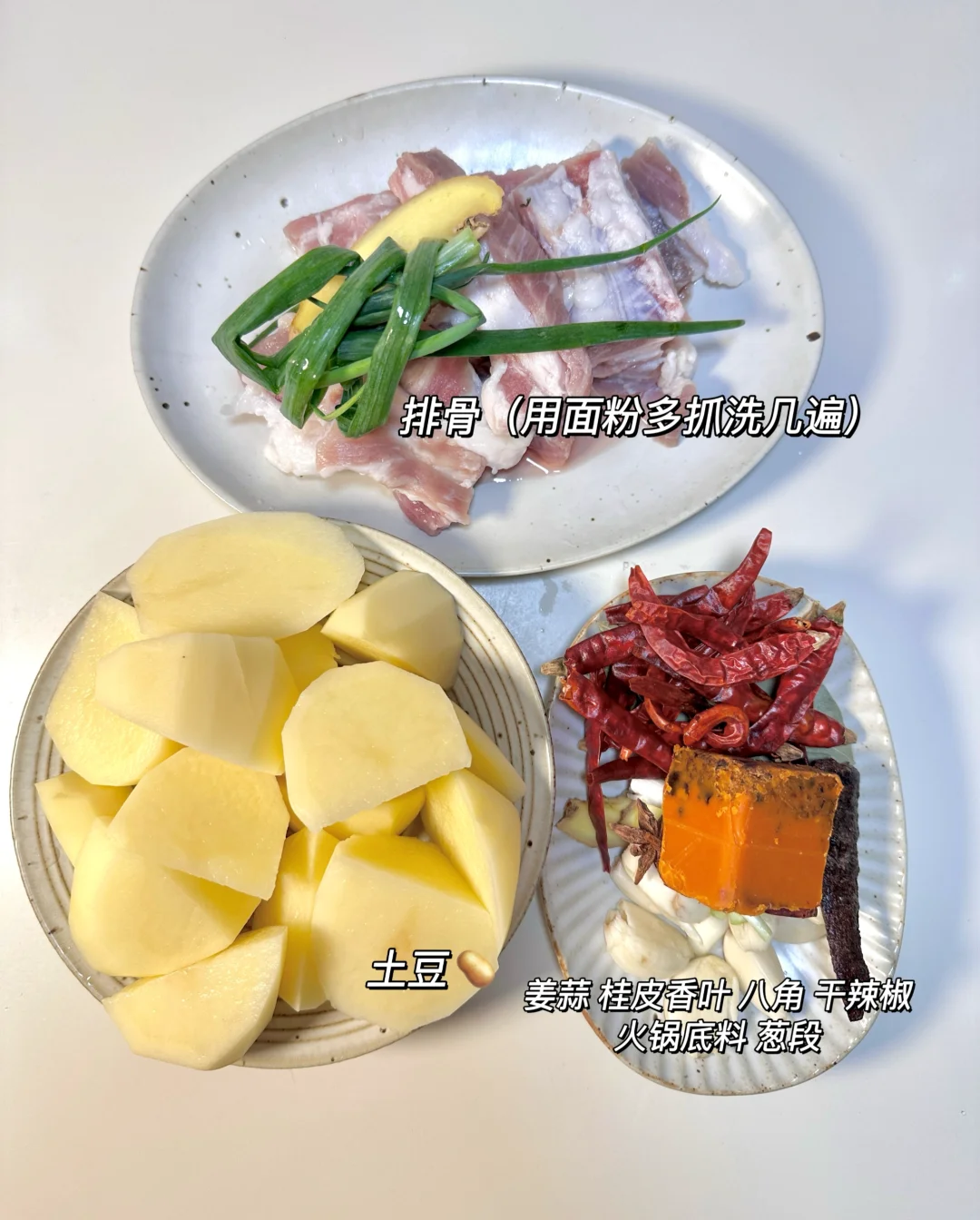 ✨食材:排骨 土豆🥔 姜 蒜 葱 桂皮八角香叶、干辣椒、一小块火锅底料。