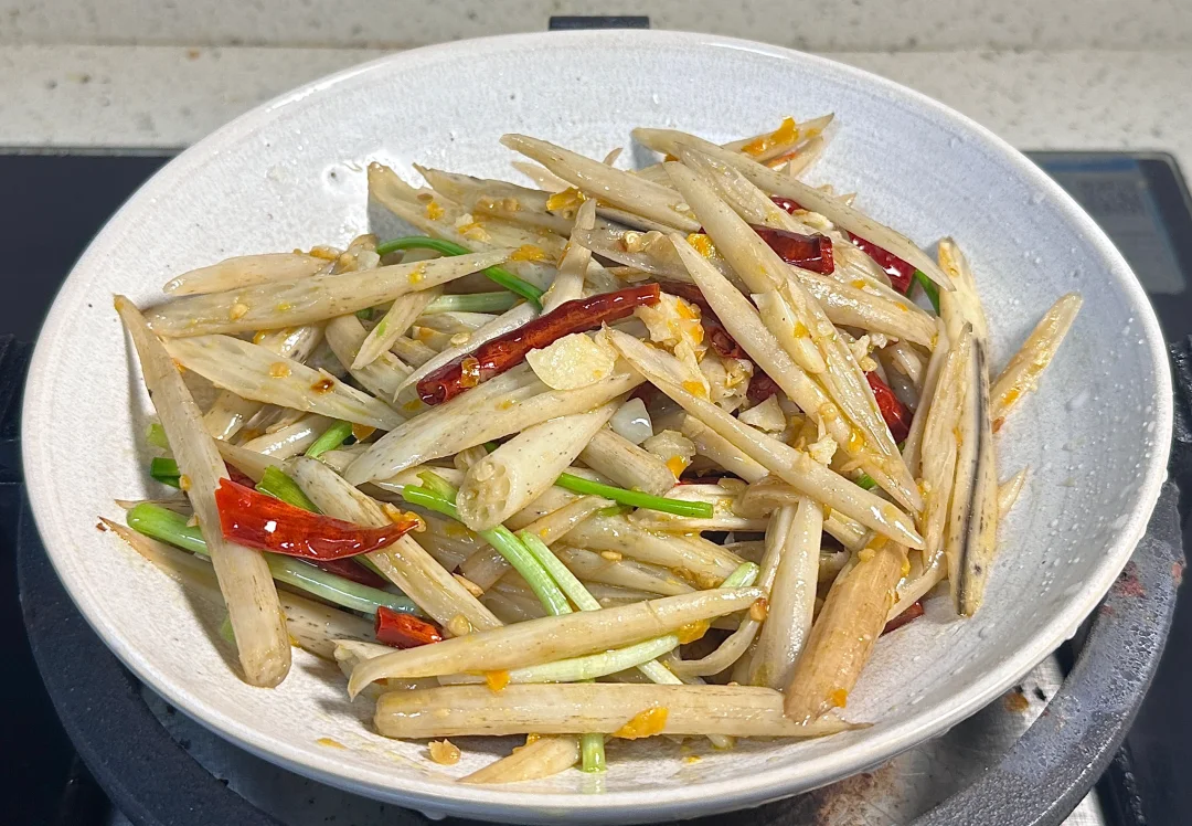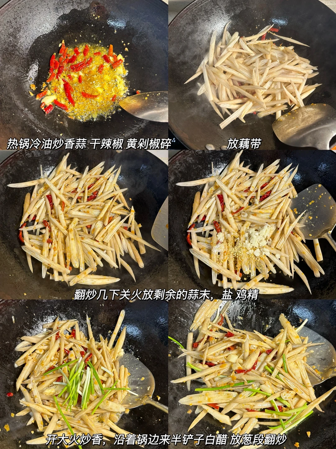 2️⃣:热锅倒油放蒜末 干辣椒 黄辣椒酱炒香,放沥干水分的藕带炒匀裹上辣椒,关火放剩余的蒜末 盐 鸡精开大火炒,沿着锅边来半铲子白醋 放葱段再炒几下。