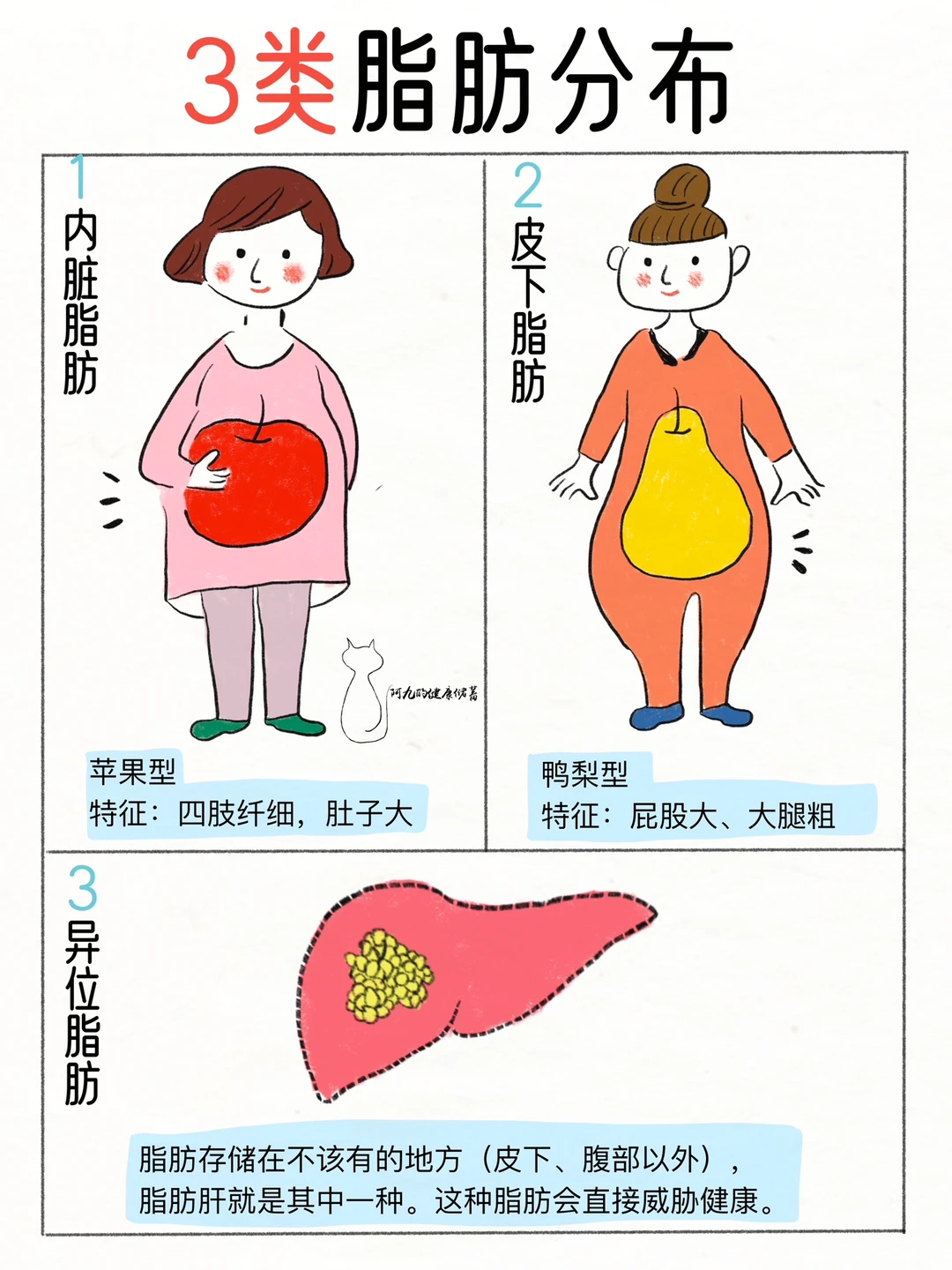 [向右R]我们身体的脂肪主要分布在三个部位:皮下脂肪、内脏脂肪、异位脂肪。皮下脂肪和内脏脂肪是人体正常存储脂肪的位置,基本上是可以从身形上辨别出来的。但异位脂肪很难辨别,脂肪存储在不该有的地方 ,而且会直接威胁健康。