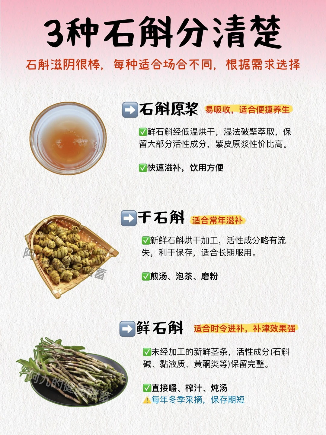 鲜石斛、干石斛和石斛原浆,它们的区别及使用场合见图3