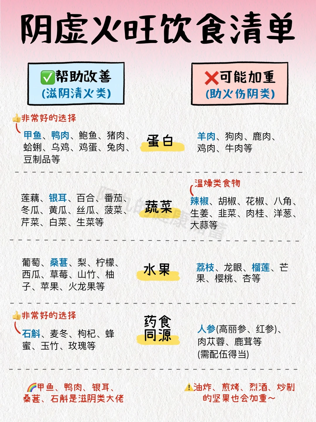 饮食中多增加滋阴的食材,减少或避免温燥助火的食材!