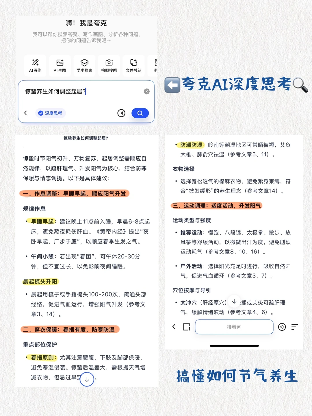 问了它很多关于惊蛰养生的问题,它会从中医和西医角度双重分析,总结出科学严谨的答案,日常养生困惑,比如如何找穴位,如何经络保养,都可以问问夸克AI,省时又省力,养生姐妹可以充分利用起来~