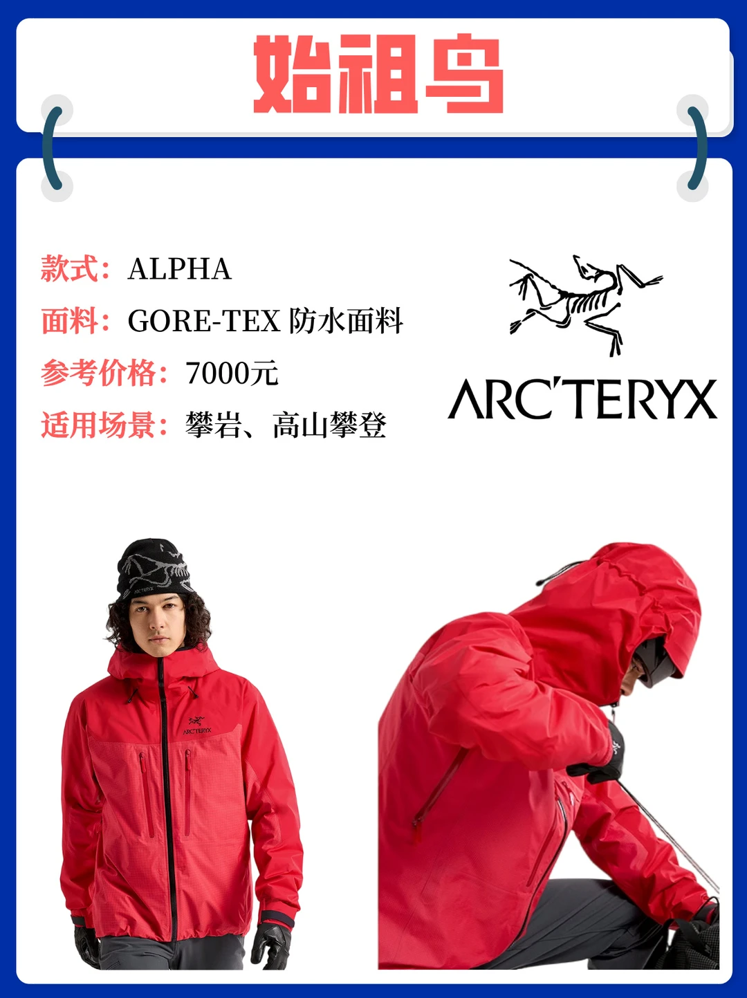[一R] 始祖鸟ARC'TERYX ALPHA:这牌子堪称户外界的 “爱马仕”,价格虽高,但品质无敌。GORE-TEX Pro 2.0 面料,防水指数高达 20000mm+,专为恶劣天气设计,适合专业登山、攀岩,但日常使用略显冗余。