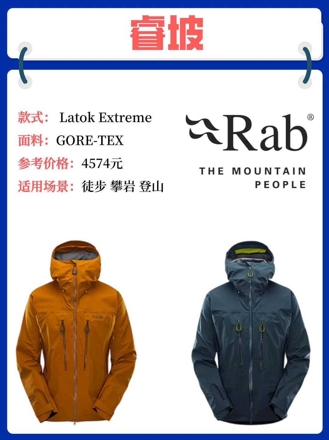 [六R] rab 睿坡 Latok Extreme: Pertex Shield 3L 面料,防水指数 20000mm。适合中高强度徒步、多雨山地环境,性价比与性能均衡。