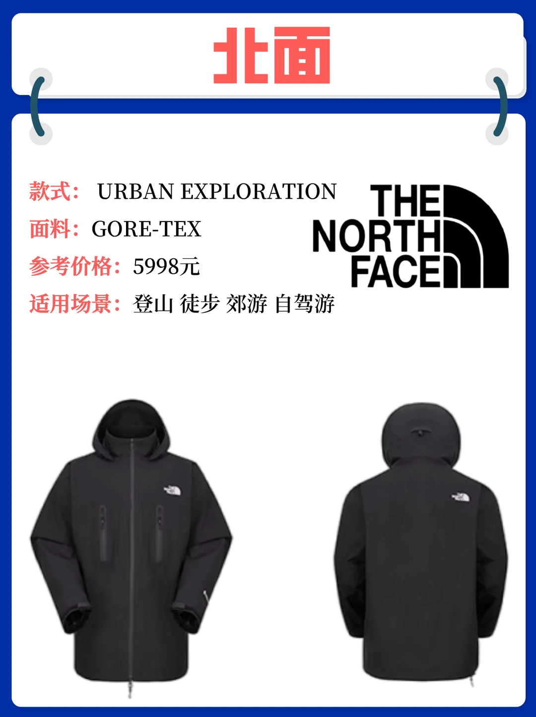 [四R] 北面THE NORTH FACE URBAN EXPLORATION:知名度高,大街上经常能看到它的身影。DRYVENT 3L 技术,防水指数 10000mm,适合多雨城市环境或短途徒步。设计时尚实用,从羽绒服到冲锋衣,款式多到挑花眼。