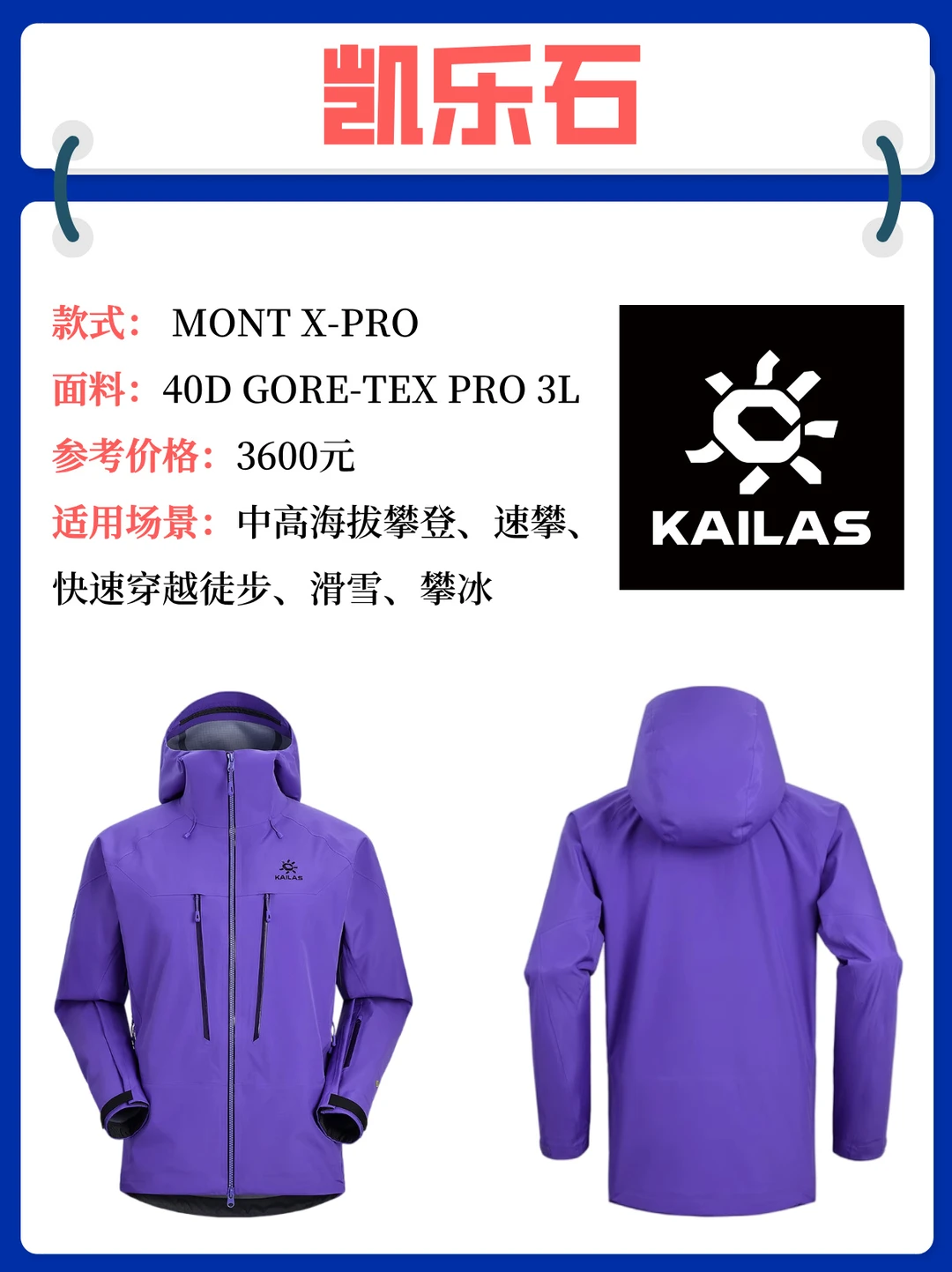 [三R] KAILAS凯乐石 MONT X-PRO:搭载40D 3L GORE-TEX PRO 面料,防水指数 20000mm+,8mm 窄压胶工艺减少接缝渗水风险。轻量化设计,作为全能型硬壳,MONT X-PRO适合徒步、滑雪及高阶技术攀登,可以放心冲!