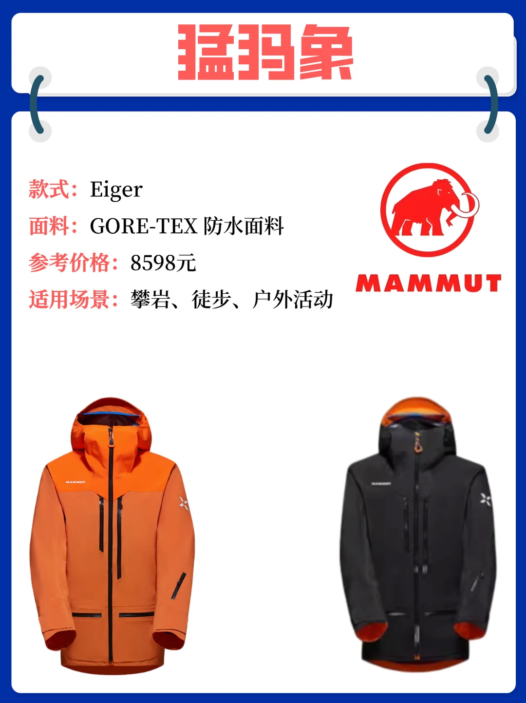 [二R] 猛犸象MAMMUT Eiger:历史悠久,专注于高端户外装备。GORE-TEX Pro 面料(部分型号采用 Pertex Shield Plus),防水指数 20000mm。适合高山探险、滑雪等极限运动,它都能陪你一起挑战!