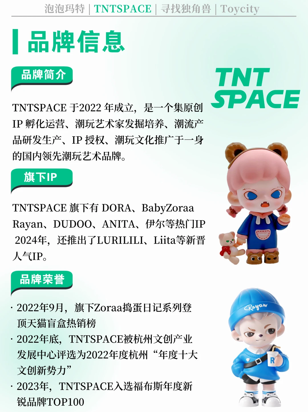 [二R] TNTSPACE:这可是个很厉害的潮玩艺术品牌,从原创 IP 孵化运营,到潮玩艺术家发掘培养,再到潮流产品研发生产、IP 授权以及潮玩文化推广,可谓是全产业链发展。旗下的 IP 各个都非常有个性。DORA,也就是大家熟知的 “大表姐”,外表拽拽的,内心却积极乐观又坚韧;Baby Zoraa 则是个可爱的萌妹子,标志性的小虎牙和奶凶奶凶的小表情,简直萌化了。两个热门 IP 全网粉丝数双双突破 300 万,是当之无愧的 “线下断货王”。