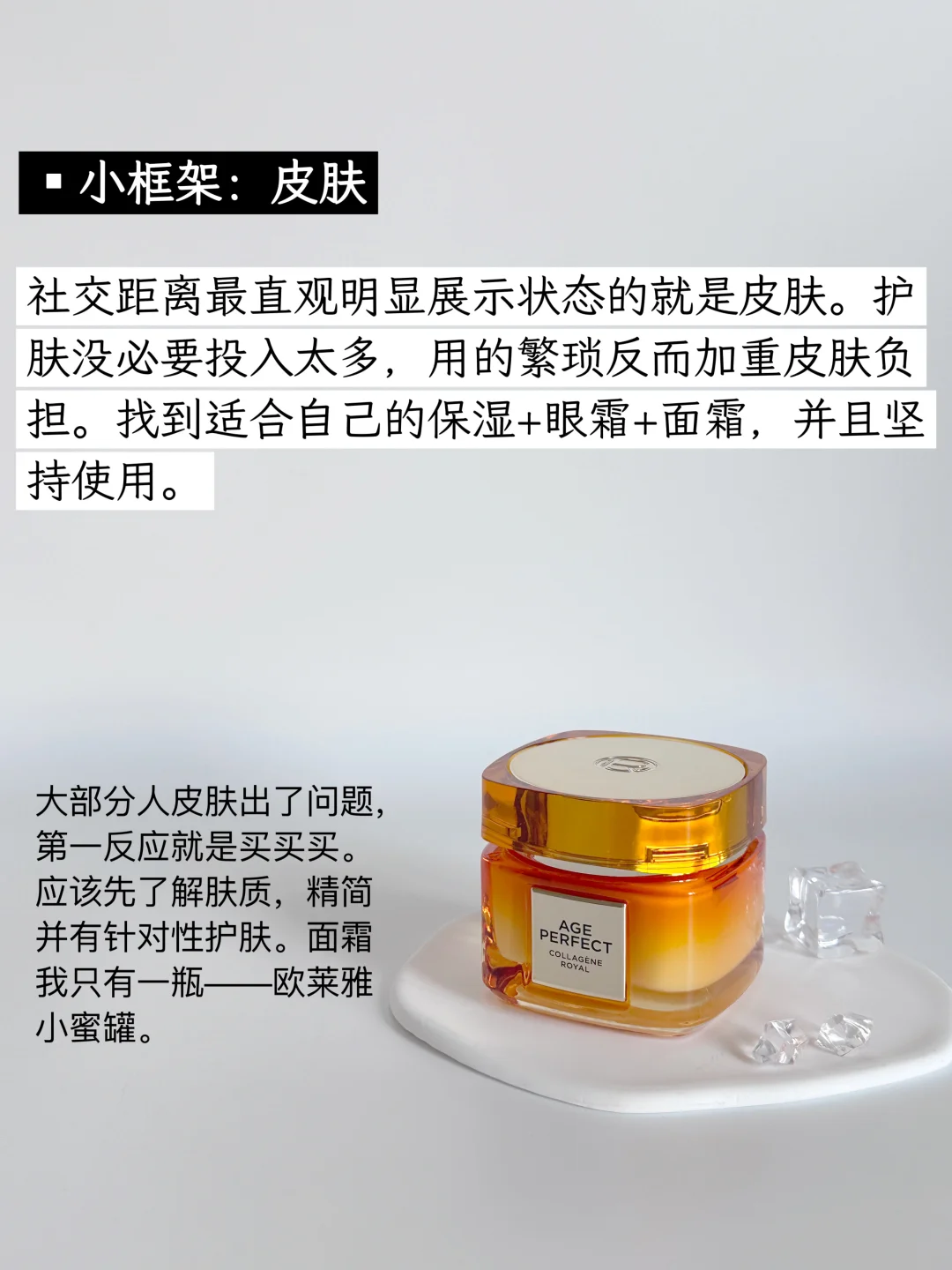 社交距离最直观明显展示状态的就是皮肤。护肤没必要投入太多,用的繁琐反而加重皮肤负担。找到适合自己的保湿+眼霜+面霜,并且坚持使用。