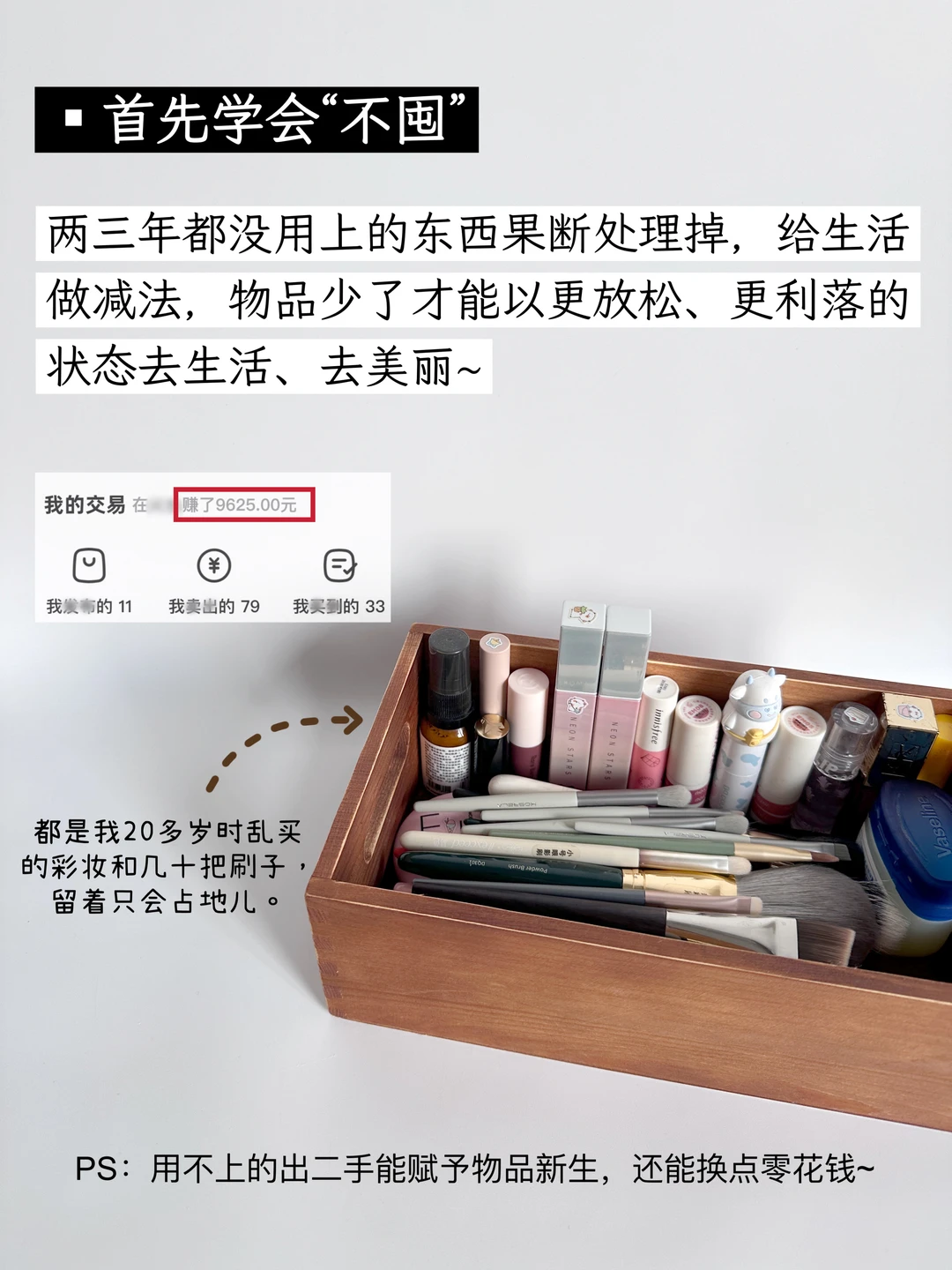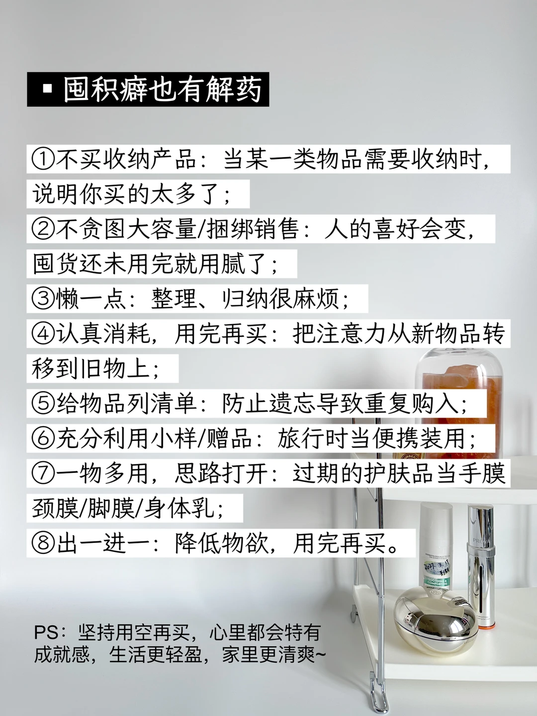 购物欲和囤积癖是相伴而来的,只有降低不必要的物欲,才能从根源上杜绝过度消费造成的大量囤积。 我的变美“3不囤”: 1.不囤食物 2.不囤彩妆 3.不囤护肤 我是小哈娜,我的精简消费观:善于思考、能挣会花、清醒败家。分享简单生活,主页隔天更新。