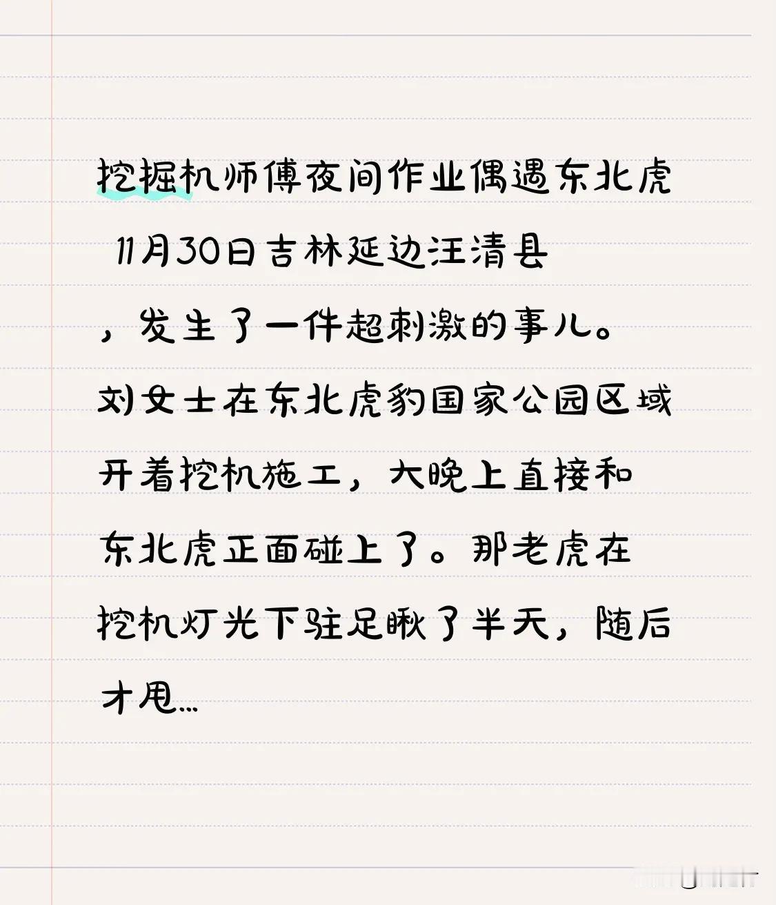 挖掘机师傅夜间作业偶遇东北虎 挖掘机师傅夜间作业偶遇东北虎 11月30日 吉林延边汪清县 发生超刺激之事 刘女士于东北虎豹国家公园区域 开着挖机施工 大晚上竟与东北虎正面遭遇 老虎在挖机灯光下驻足良久 随后甩尾进山林 虽未伤人 却把刘女士吓得不轻 还有老李 开了近二十年挖掘机 在深山赶工期 凌晨作业时 起初以为黑影是野狗 结果竟是头壮硕东北虎 距操作室仅十米 老李吓得关了机器不敢动 东北虎停留二十分钟 还几次靠近 最近处不到五米 老李手心满是汗 这经历 想想都后怕! 东北虎林区 挖掘机 野东北虎 挖掘机全景影像 山东偶遇东北虎 挖掘机施工作业