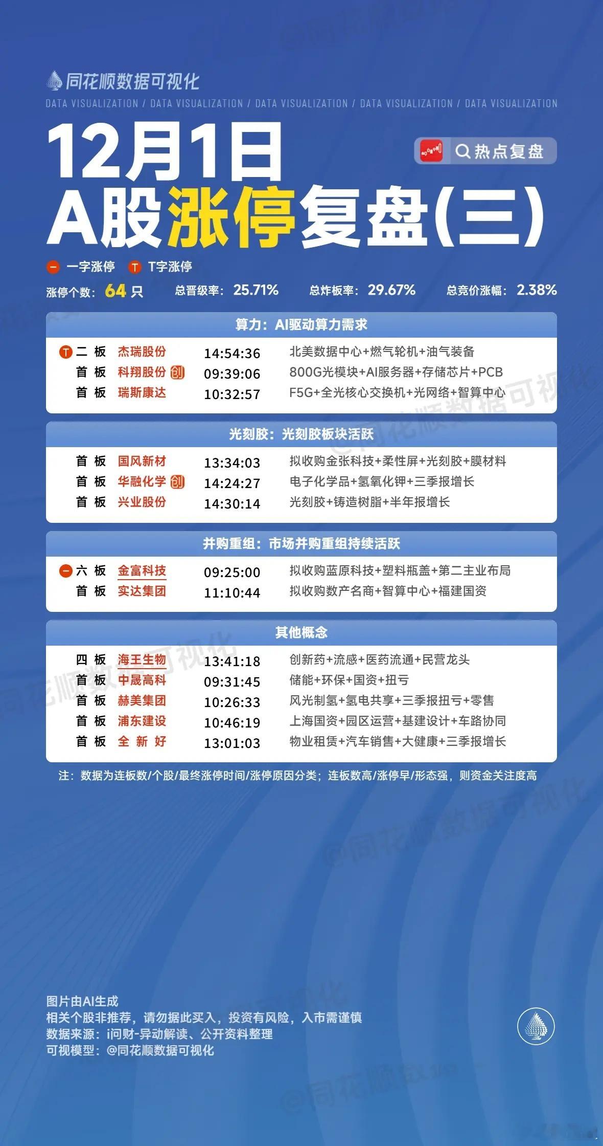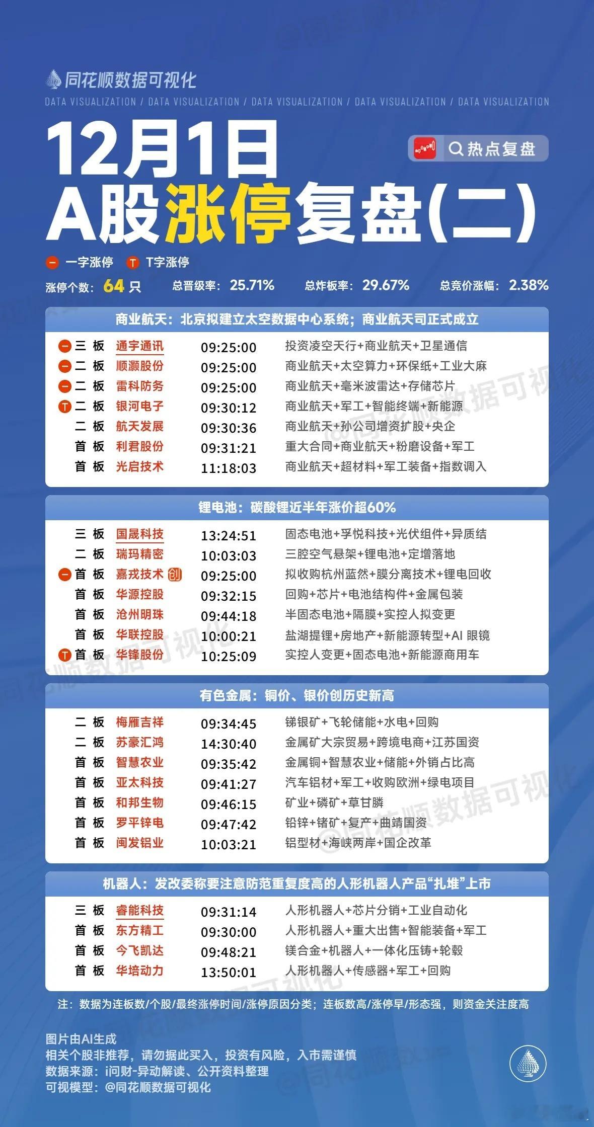 12月1日A股复盘:5只热门个股隔日走势前瞻一、航天发展(商业航天+海峡概念)今日商业航天板块迎来强势爆发,板块效应拉满:通宇通讯竞价阶段斩获24亿巨额封单,雷科防务、顺灏股份、银河电子均以一字板开盘,板块热度可见一斑。航天发展凭借高市场辨识度,竞价尾声获资金抢筹至近涨停开盘,开盘后资金直接硬顶封板。全天板块分歧极小,最终助力个股走出强势连板行情。龙虎榜数据显示,桑田路、学院南路、华林证券北京分公司、江苏路等知名游资纷纷入场接力,卖盘抛压微弱,首板介入的4家游资更是集体锁仓。不过这样的榜单暗藏隐忧:两日介入资金均以短线资金为主,若隔日板块分歧加剧,这类资金大概率会集中兑现,引发较大抛压,新资金能否强势承接尚存变数。此外,个股连续两板量能释放不足,短期获利盘堆积较多,且并非商业航天绝对前排标的,持续缩量晋级难度极大。隔日需重点关注高开下杀后的承接力度,若承接稳健,或有望在高位延续趋势行情。二、中兴通讯(AI手机概念)消息面传来重磅利好:字节跳动豆包团队与中兴旗下努比亚品牌联手打造AI手机,首款搭载豆包手机助手技术预览版的工程样机努比亚M153已少量发售,该消息为AI手机赛道注入强劲动力,使其成为今日市场最强主线。受益于此,中兴通讯强势涨停,尽显龙头风范。龙虎榜呈现豪华做多阵容:中山东路、江苏路游资买入金额均超6亿元,新闸路、成都系资金也各有4亿元左右买入,卖盘抛压温和。作为AI手机领域的权重标的,中兴通讯此番强势表现极具标杆意义,隔日冲高已成大概率事件。其后续能否走出趋势性行情,将直接决定AI手机板块的持续性——正如此前三六零的强势带动AI应用板块走强,此次中兴通讯的表现或推动AI手机成为市场新主线,堪称该方向能否站稳脚跟的核心风向标。三、实达集团(AI应用+海峡概念)该股在5进6失败遭遇负反馈后,上周五虽有资金强势翘板但最终回落,今日早盘延续低开态势。不过低开后小幅下杀之际,资金迅速进场拉升,盘中一度冲高至涨停板附近,随后短暂回落,在分时均线的强力支撑下再度上攻,成功封板,完成龙虎回调后的首板修复。龙虎榜表现为游资良性换手格局:国联证券宁波分公司大举买入2.5亿元,华泰证券苏州吴中大道营业部继续加仓近7000万元,总持仓达1.3亿元;卖盘方面,新闸路、温州帮资金选择止盈离场。但需注意,国联证券宁波分公司一家独大的买入格局,隔日能否抵御抛压是个股延续行情的关键。今日AI应用板块虽有修复,但多只个股冲高回落,实达集团的涨停略显独木难支,即便有海峡概念加持,若隔日板块后排缺乏支援,持续性将大打折扣。操作上,若早盘冲高未能形成足够封板动能,建议及时止盈离场。四、国晟科技(锂电池概念)早盘竞价阶段,国晟科技在与道明光学的直接PK中占据上风,开盘后一度保持强势领先。但道明光学凭借AI手机概念的加持,迅速获资金青睐并快速封板,这一态势对国晟科技形成明显冲击,引发资金集中抢跑下杀。好在随后有资金及时承接,股价止跌回拉,但并未出现主动封板资金,全天在高位持续放量震荡。午后借助良好的大盘环境与短线氛围,资金再度发力承接封板,最终走出高位烂板走势。龙虎榜显示,买盘端清一色为量化资金,卖盘方面江苏路游资止盈近8000万元,周五介入的曙光路资金也已兑现离场。考虑到个股涨停后,隔日将面临30个交易日涨幅达200%的严重异动限制,资金接力意愿本就谨慎,量化资金的持续引导无疑是加分项。作为今日锂电池板块的最高标(道明光学涨停更多受益于AI手机概念),若隔日竞价表现强劲,且不惧异动限制主动突破,可进一步高看一线;其竞价表现,或将反映出市场资金对短线严重异动规则的态度,甚至不排除成为跨年妖股的可能。五、道明光学(AI手机+锂电池概念)该股前一日以一字板拿下二板后,今日早盘平开表现稍显弱势。不过得益于整体向好的短线市场环境,开盘后有资金主动拉升,但因竞价阶段弱于国晟科技,部分资金选择兑现离场,股价出现短暂波动。随着AI手机板块消息面发酵,道明光学迅速成为资金追捧焦点,股价快速直线拉升封板,成功走出放量三连板形态。作为AI手机方向的绝对龙头,道明光学的隔日表现至关重要:中兴通讯的涨停已预示AI手机赛道具备成为后续热点的潜力,这也让道明光学拥有更强的隔日预期,若盘中承接足够强劲,有望冲击一字板。反之,若隔日给到明确的接力机会,则可能意味着AI手机板块存在一日游风险,其竞价强度将直接反映板块的持续性。