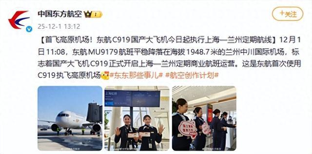 12月1日11:08,东航MU9179航班平稳降落在海拔1948.7米的兰州中川国际机场,标志着国产大飞机C919正式开启上海—兰州定期商业航班运营。这是东航首次使用C919执飞高原机场。