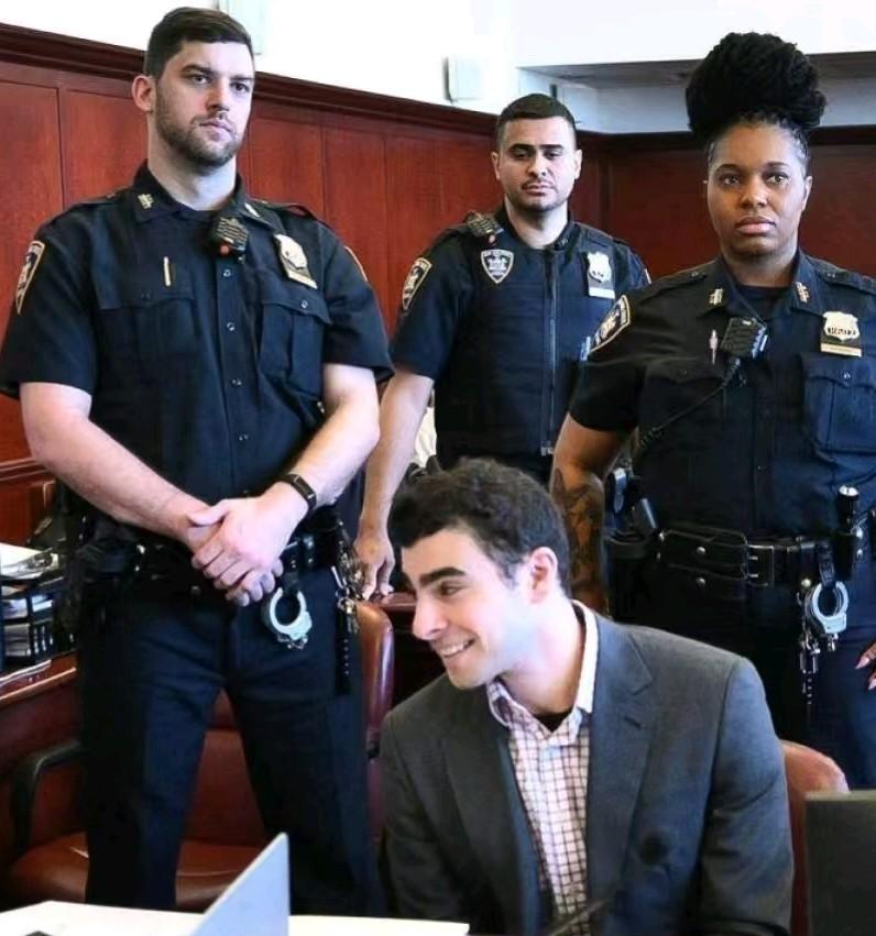 路易吉每次出庭都有人安排他的穿搭,这次的造型有点显老,反而将后面左侧的男押解员衬得俊朗帅气。 女押解员的发型比较吸睛,像顶了个足球,表情很严肃。 被审判的人和不被审判的人境遇是完全不同的。 后面的几个人虽然都没笑,但神态坦然,他们只是在完成自己的工作。 路易吉虽然在笑,却前途未卜,抬头纹一层层的叠在一起。即便嘴角上扬,也不可能做到真正的放松。