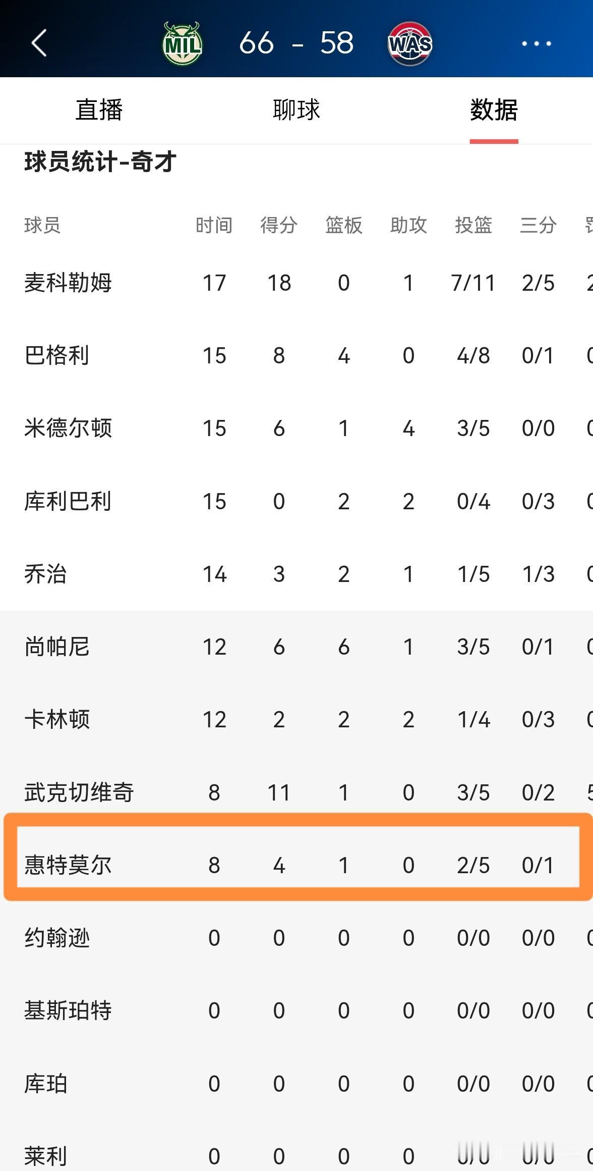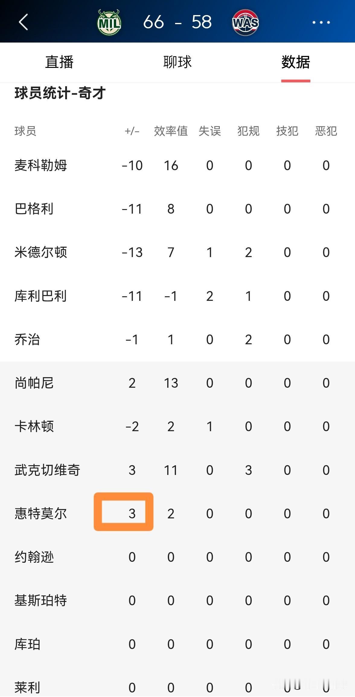奇才新星惠特摩尔的场上正负值终于是正值了!在今天奇才主场迎战雄鹿的比赛中,目前双方半场战罢,奇才以58:66落后于对手。虽然奇才目前处于落后,但是惠特摩尔在替补出战的8分钟里,投篮5中2得到4分1篮板,他的场上正负值为全队并列最高的+3。