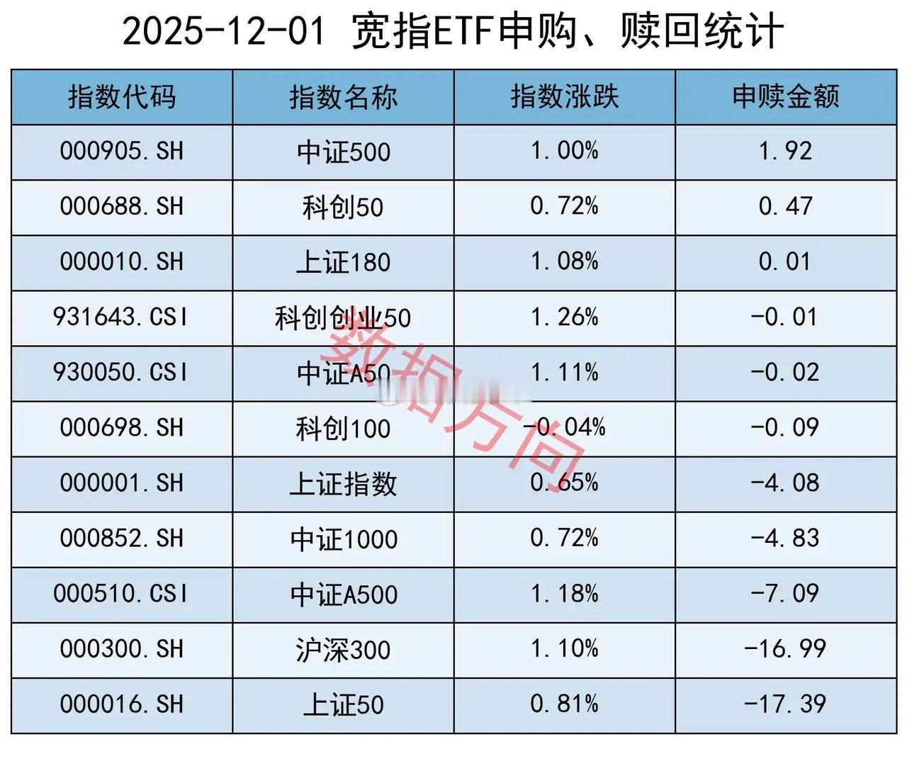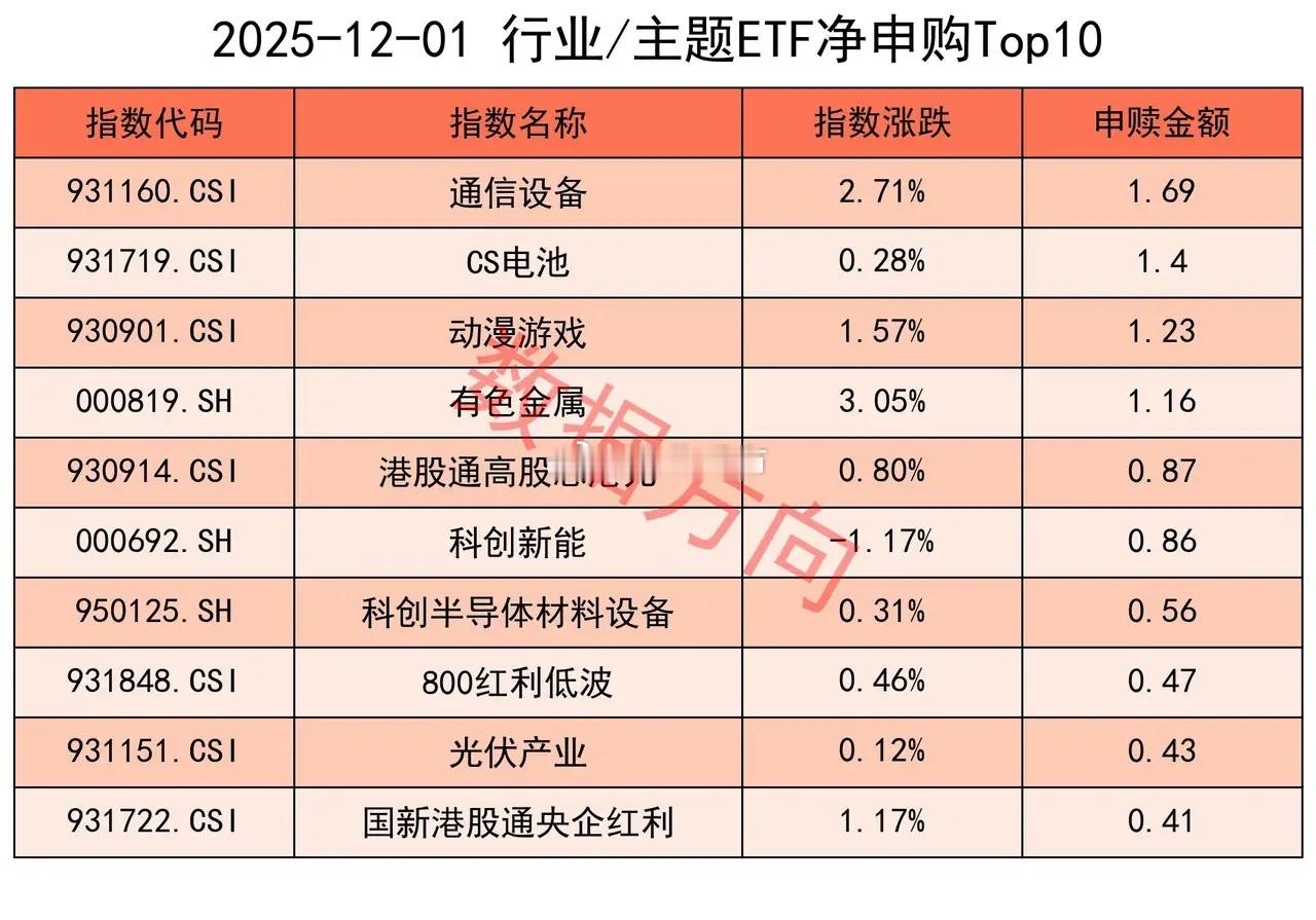 上交所ETF连续5天净赎回12月1日星期一,大盘放量上涨收获开门红,有色金属、智能手机涨幅居前。上证指数涨幅0.65%,上交所ETF合计净赎回71.02亿元。这是连续第5天净赎回。宽指中证500指数(1.92亿)、科创50指数(0.47亿)、上证180指数(0.01亿),分别获小幅净申购。上证50指数(-17.39亿)、沪深300指数(-16.99亿),双双净赎回超过15亿。中证A500指数(-7.09亿),净赎回超5亿。中证1000指数(-4.83亿)、上证指数(-4.08亿)、科创100指数(-0.09亿)、中证A50指数(-0.02亿)、科创创业50指数(-0.01亿),分别被小幅净赎回。行业和主题 CS电池指数(1.4亿)、科创新能指数(0.86亿)、光伏产业指数(0.43亿),一起进入申购榜。港股通高股息港元指数(0.87亿)、800红利低波指数(0.47亿)、国新港股通央企红利指数(0.41亿),一起进入申购榜。其他进入申购榜的还有:通信设备指数(1.69亿)、动漫游戏指数(1.23亿)、有色金属指数(1.16亿)、科创半导体材料设备指数(0.56亿)。中证银行指数(-4.49亿)、证券公司指数(-4.11亿)、300非银指数(-1.09亿),一起进入赎回榜。军工龙头指数(-1.64亿)、中证军工指数(-1.62亿)、卫星产业指数(-1.3亿),一起进入赎回榜。其他进入赎回榜的还有:半导体指数(-2.56亿)、红利低波指数(-1.99亿)、SSH黄金股票指数(-1.73亿)、机器人指数(-1.5亿)。