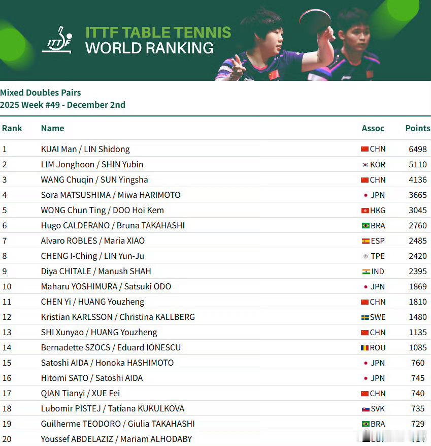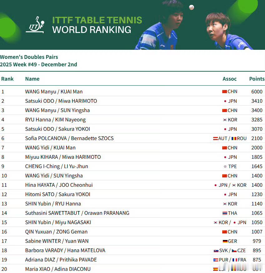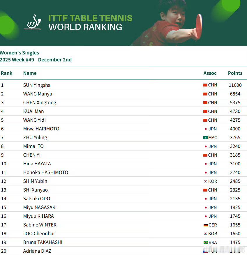 孙颖莎连续177周女单第一她依旧稳稳站在巅峰!国际乒联第49周世界排名公布,孙颖莎以11600分持续领跑女单榜单,实现连续177周世界第一的统治级纪录男单方面,王楚钦9925分稳居榜首,小将林诗栋位列第二,国乒强势包揽前二!女单更是霸屏:王曼昱、陈幸同、蒯曼、王艺迪紧随其后,占据前五中的四席双打赛场:🔹女双王曼昱/蒯曼排名第一🔹混双林诗栋/蒯曼位列榜首国乒在五项排名中均占有多席领先,梯队厚度令人惊叹!2025国际乒联第49周排名 下一站,继续向前冲!