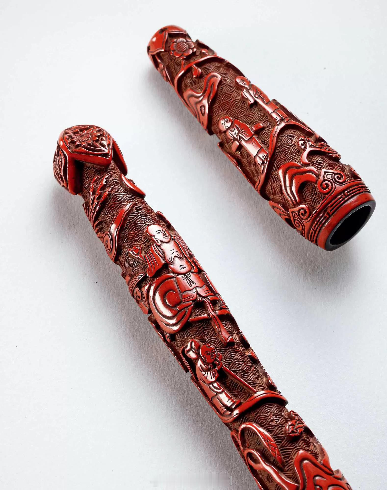 髹饰录 | 明晚期 剔红人物故事图笔备注:日本藏家旧藏明王朝建立以后,由于皇室的喜爱及对外赏赐的需要等原因,剔红漆器得到了较快发展。据文献记载,明初皇家漆器作坊设于北京果园厂,后人习惯将明代宫廷漆器称为“厂器”。宣德朝以后,剔红漆器的制作陷入低潮,但到了嘉靖时期,又再次繁荣起来,这一时期的剔红作品相比于明初,其刀工更为大气,锋芒毕露,不拘小节。本品笔管、笔帽皆为雕漆制成,漆层肥腴,色泽红润鲜亮。其笔管呈流线形,头尾细,中间粗,执于指尖十分舒适,颇宜挥毫书画,笔帽略作锥形,恰好套过笔头。笔身方寸之间满剔纹饰,刻祥云为地,主体为明清常见的婴戏图案,可见山石花叶之间有数名童游戏玩闹,观其神态各异,尽显无邪之态。笔管及笔帽环节处雕饰如意云头纹及宝钱纹。此笔髹漆厚重,漆色深沉,刀口深峻圆润,具有明代雕漆的典型风格,是一件难得的明代雕漆文房用具。尺寸:长23cm来源:保利2025秋拍《醉花荫—海内外名藏漆器》